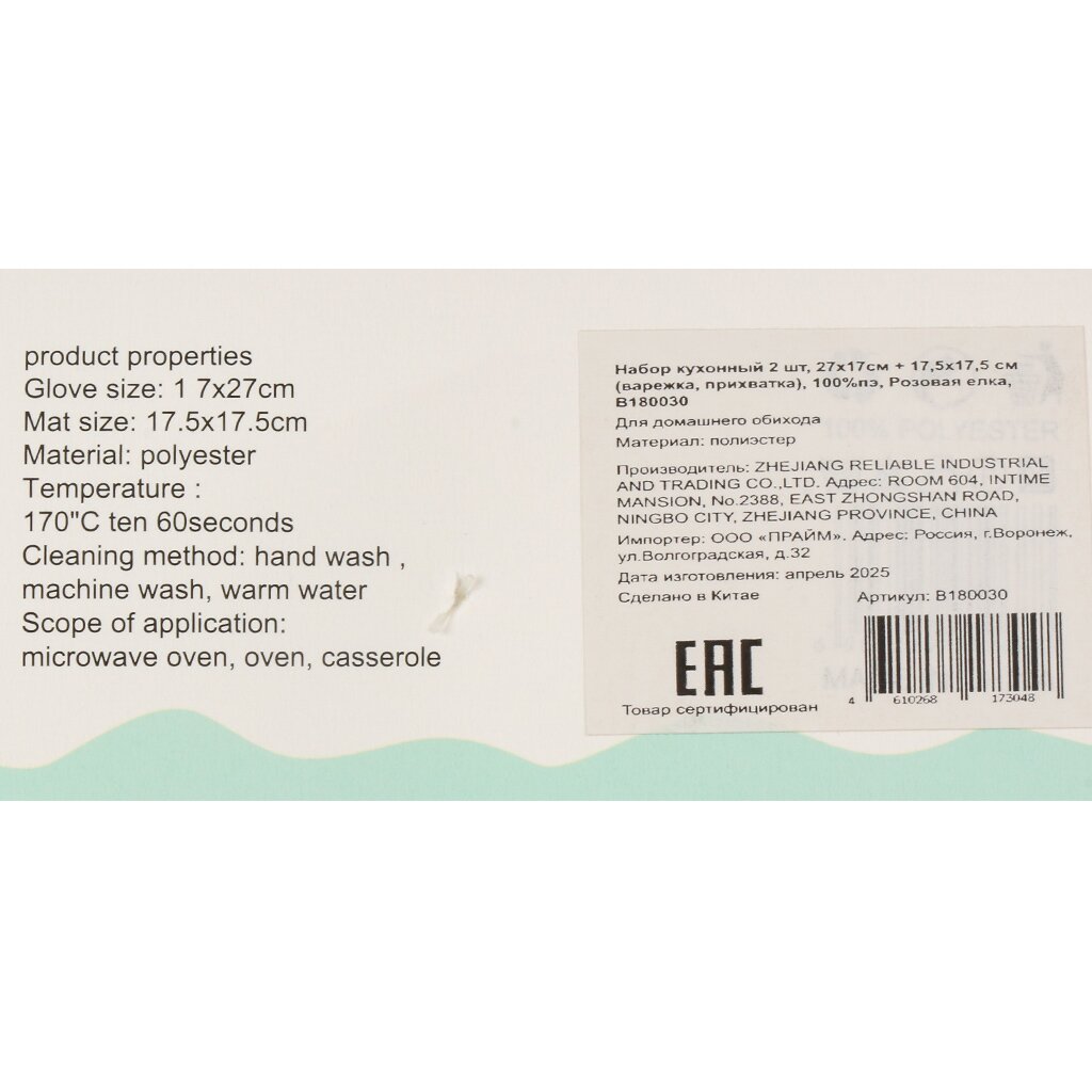 - Практичные размеры: варежка 27х17 см удобно защищает кисть, прихватка 17,5х17,5 см — для горячей посуды; прочный 100% полиэстер сохраняет форму и цвет.