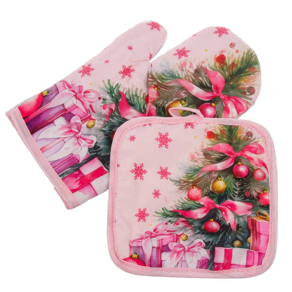 Набор кухонный 2 шт (варежка 27х17 см + прихватка 17,5х17,5 см) «Розовая елка»: стильный подарок для уютных праздников, защита рук и декор кухни.