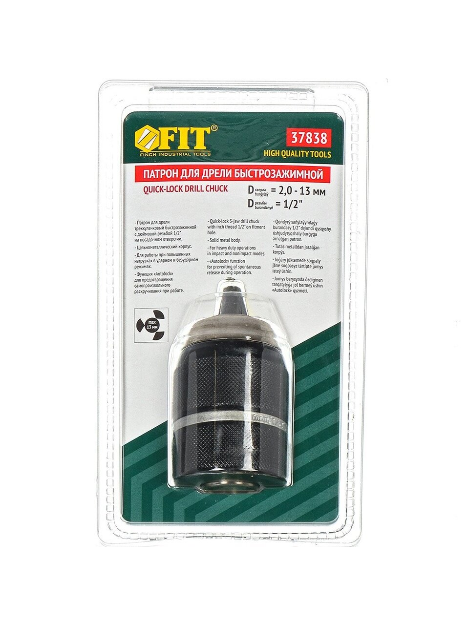 Патрон для дрели Fit, 2-13 мм, цельнометаллический, быстрозажимной, 3-кулачковый, под биту, 37838