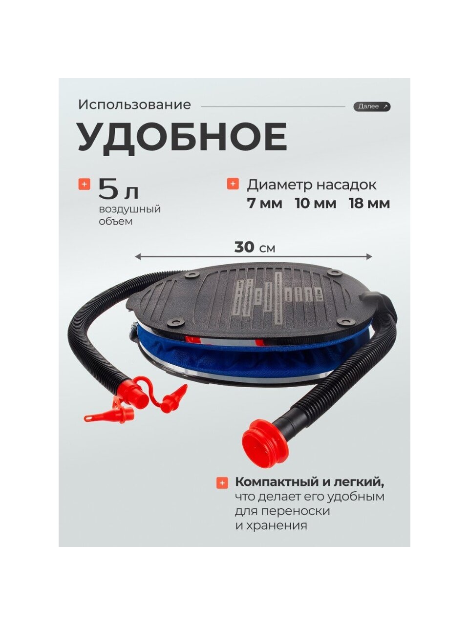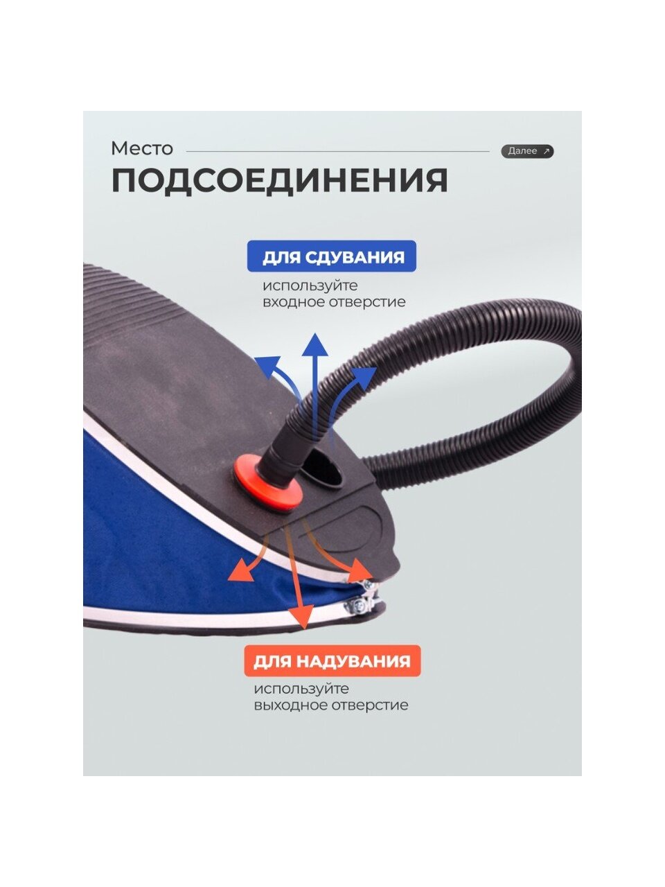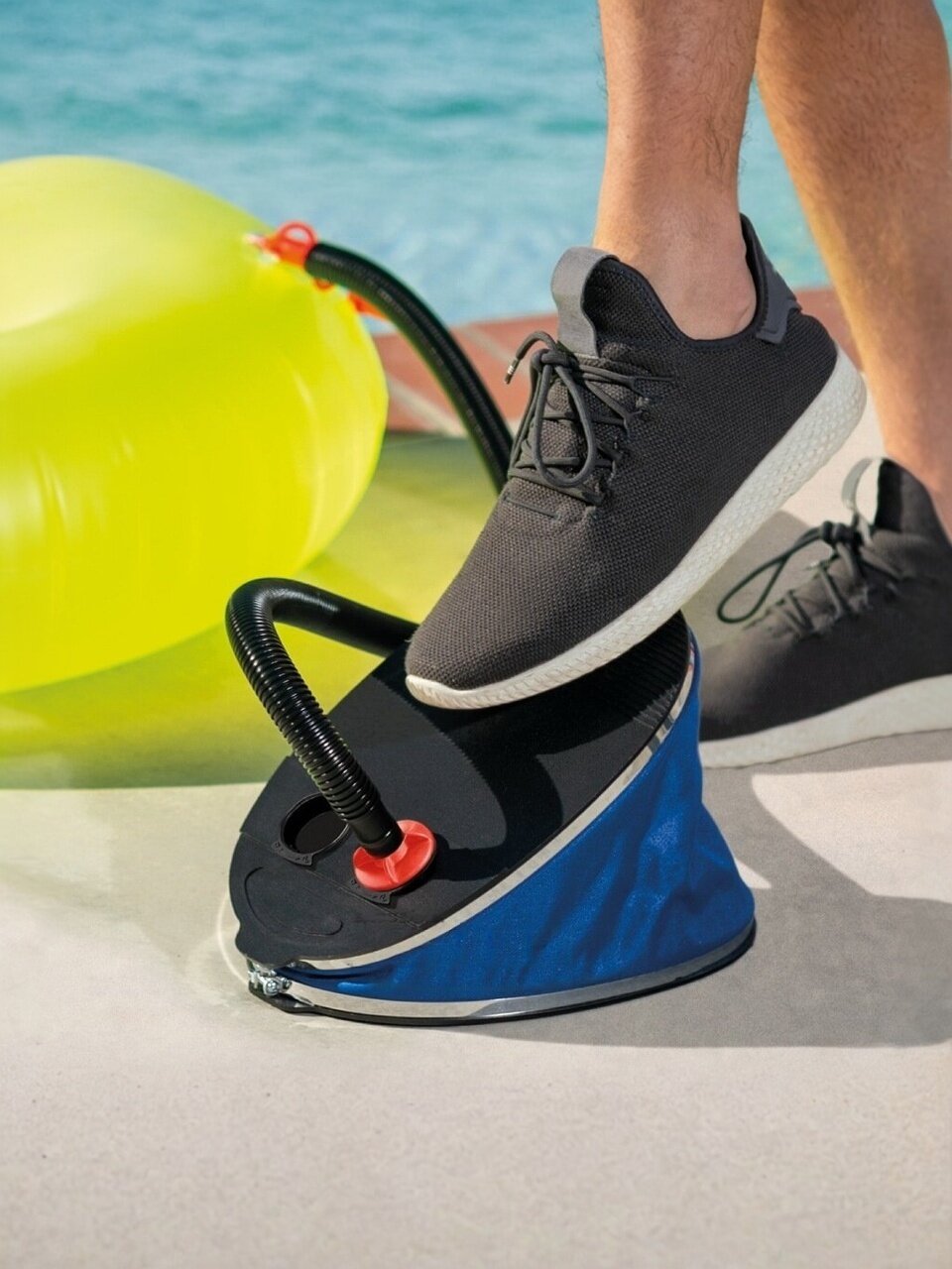 Насос ножной - это удобный и практичный инструмент, который станет незаменимым помощником во многих ситуациях. С помощью него можно легко накачать небольшие и среднего размера надувные изделия, такие как: игрушки, мячи, кровати, матрасы, лодки, бассейны с надувным верхом и т.п.