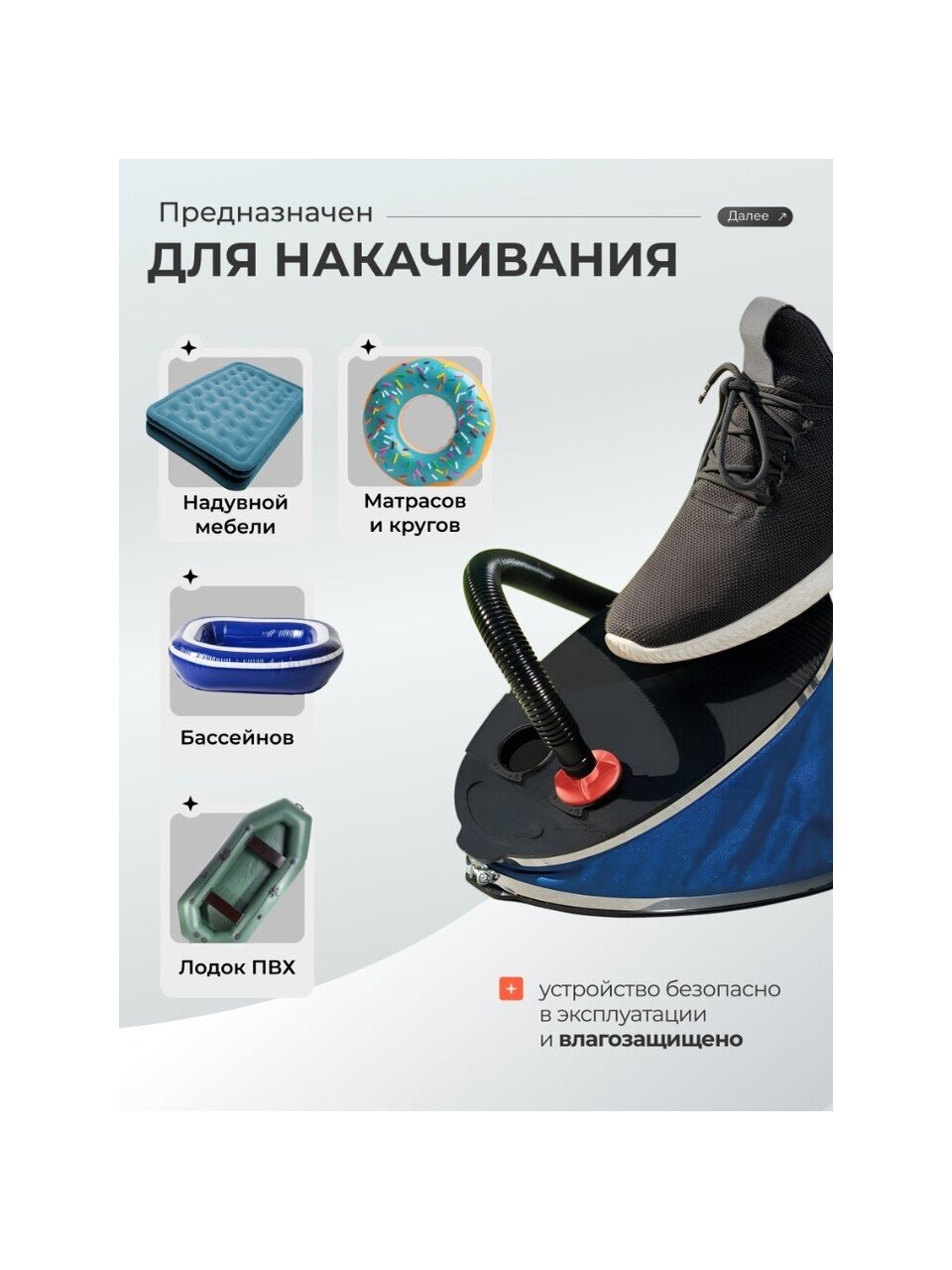 - Имеет ножную педаль, которая позволяет надувать и сдувать изделия без лишних усилий. Это особенно удобно, когда нужно накачать большой объем воздуха.