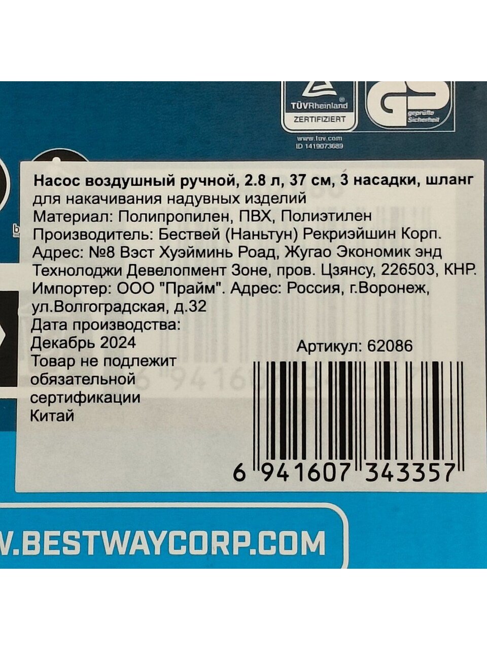 Вы можете приобрести «Насос воздушный ручной, 2.8 л, 37 см, 3 насадки, шланг, Bestway, 62086» и другие товары в нашем интернет-магазине в Орле по низким ценам и с бесплатным самовывозом.