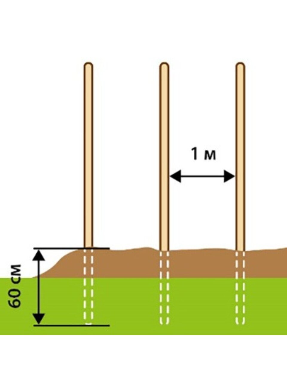 - Вкопать или вбить опорные колышки в грунт на глубину 50-60 см. Расстояние между опорами 1 м. Высота колышек должна быть не менее 1,5 м.