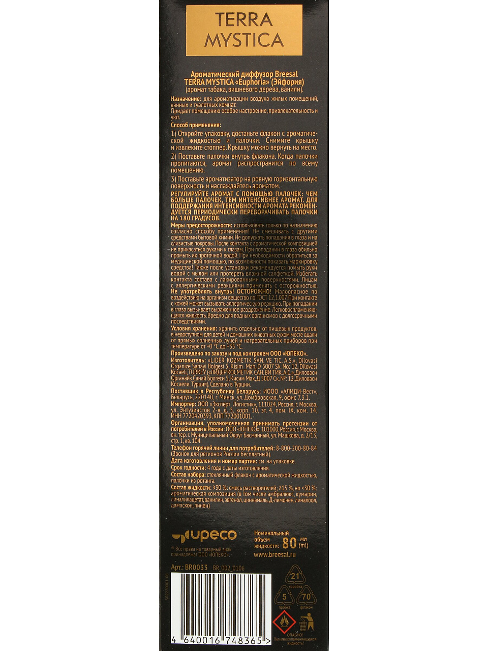 Аромадиффузор Breesal Terra Mystica «Essence» Эйфория 80 мл: создайте атмосферу уюта и расслабления дома или на даче — идеальный подарок для себя и близких.