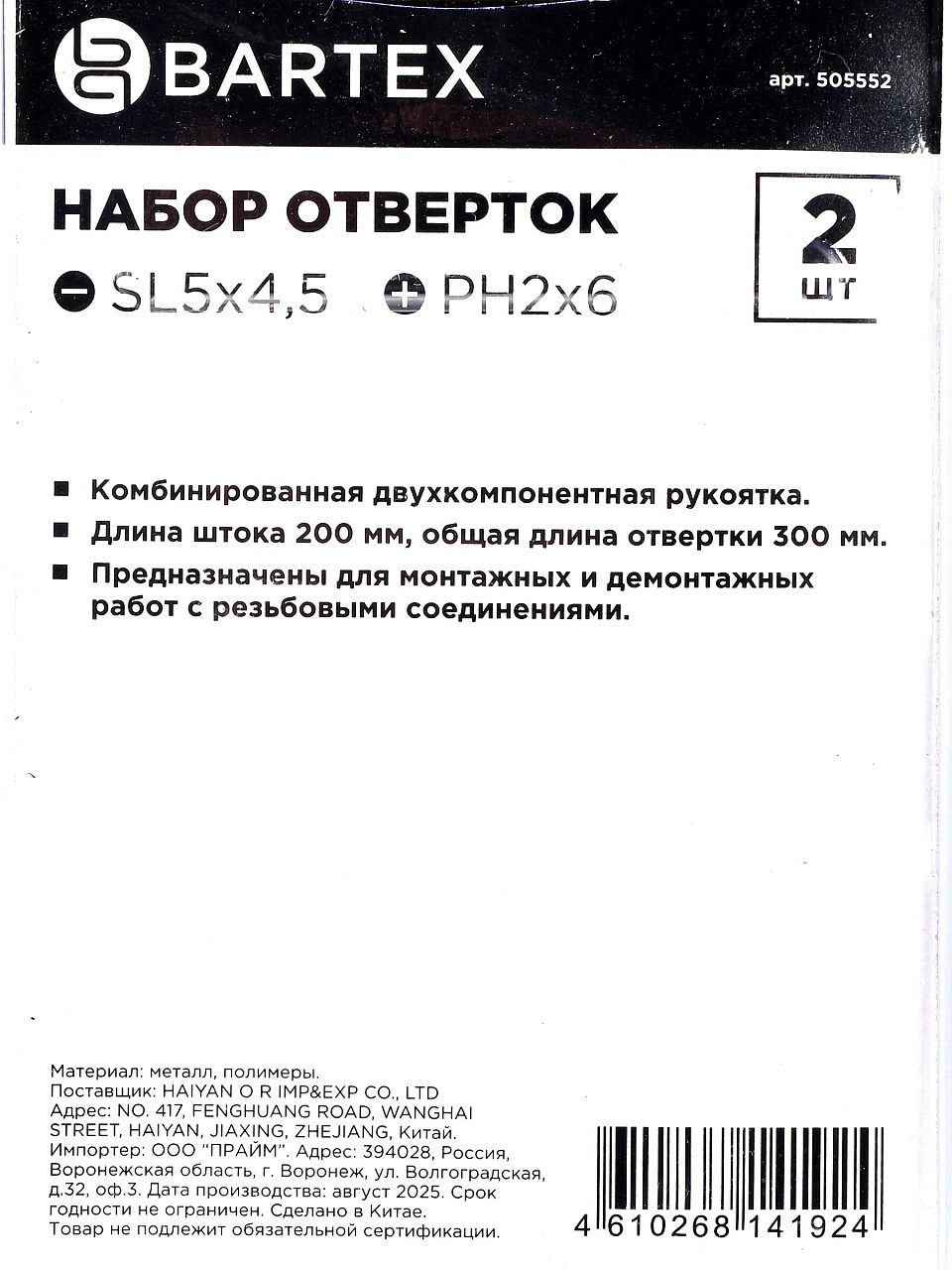 Вы можете приобрести «Набор отверток 2 предмета, Bartex, PH2x6, SL5x4.5, двухкомпонентный, блистер» и другие товары в нашем интернет-магазине в Россоши по низким ценам и с бесплатным самовывозом.