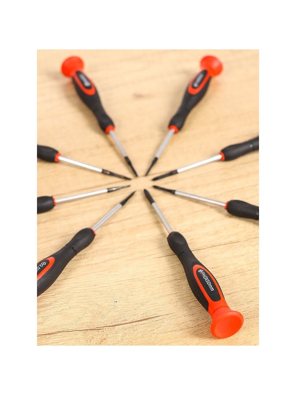 Ручки с двухкомпонентным покрытием обеспечивают уверенный хват и предотвращают скольжение даже при длительной работе. Прочные стержни из CrV стали гарантируют долговечность и устойчивость к износу, а магнитные наконечники упрощают фиксацию мелких крепежей — больше не нужно переживать о потере винтиков и болтиков. Черный цвет набора выглядит стильно и современно, подчеркивая профессиональный подход к организации рабочего пространства.