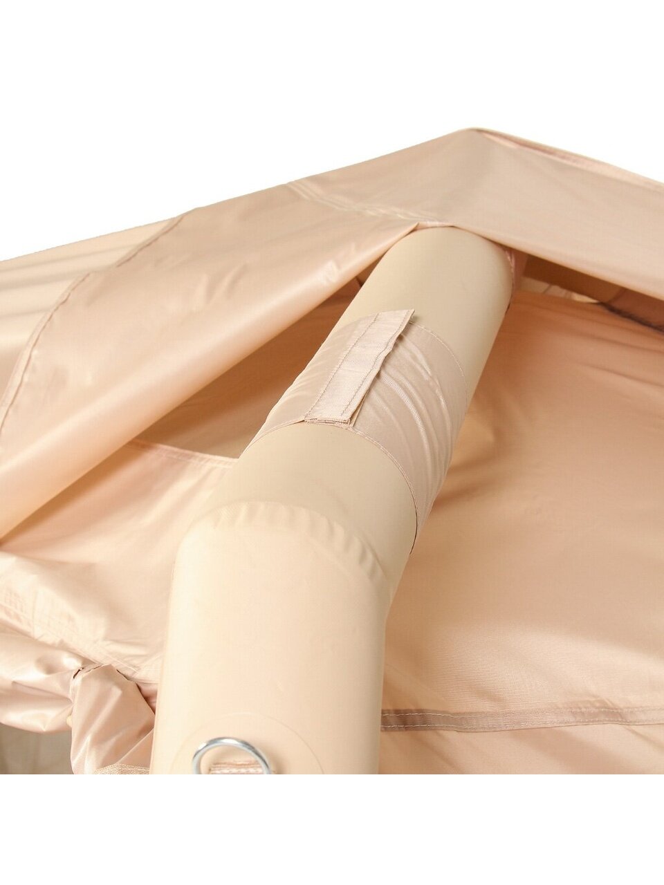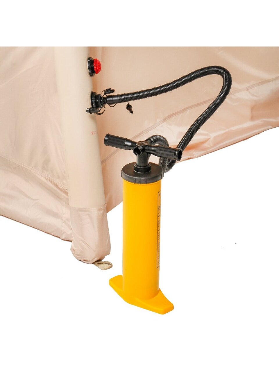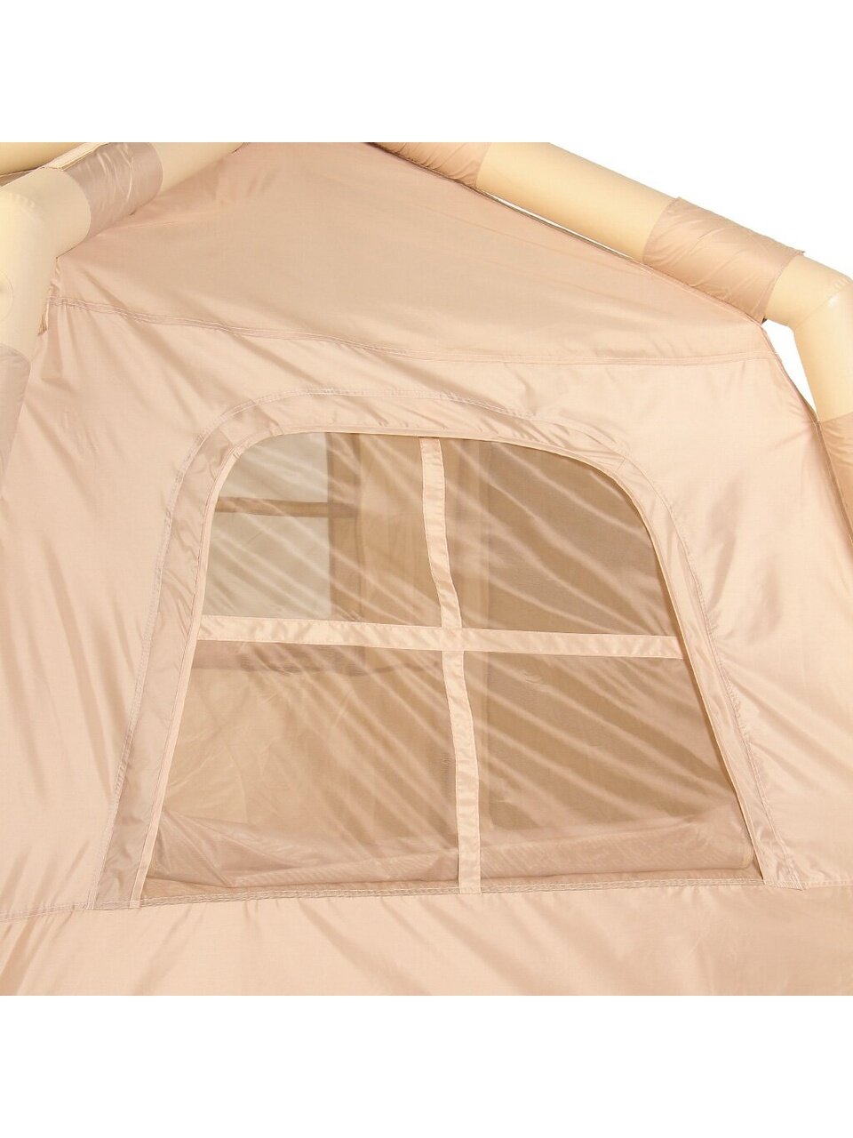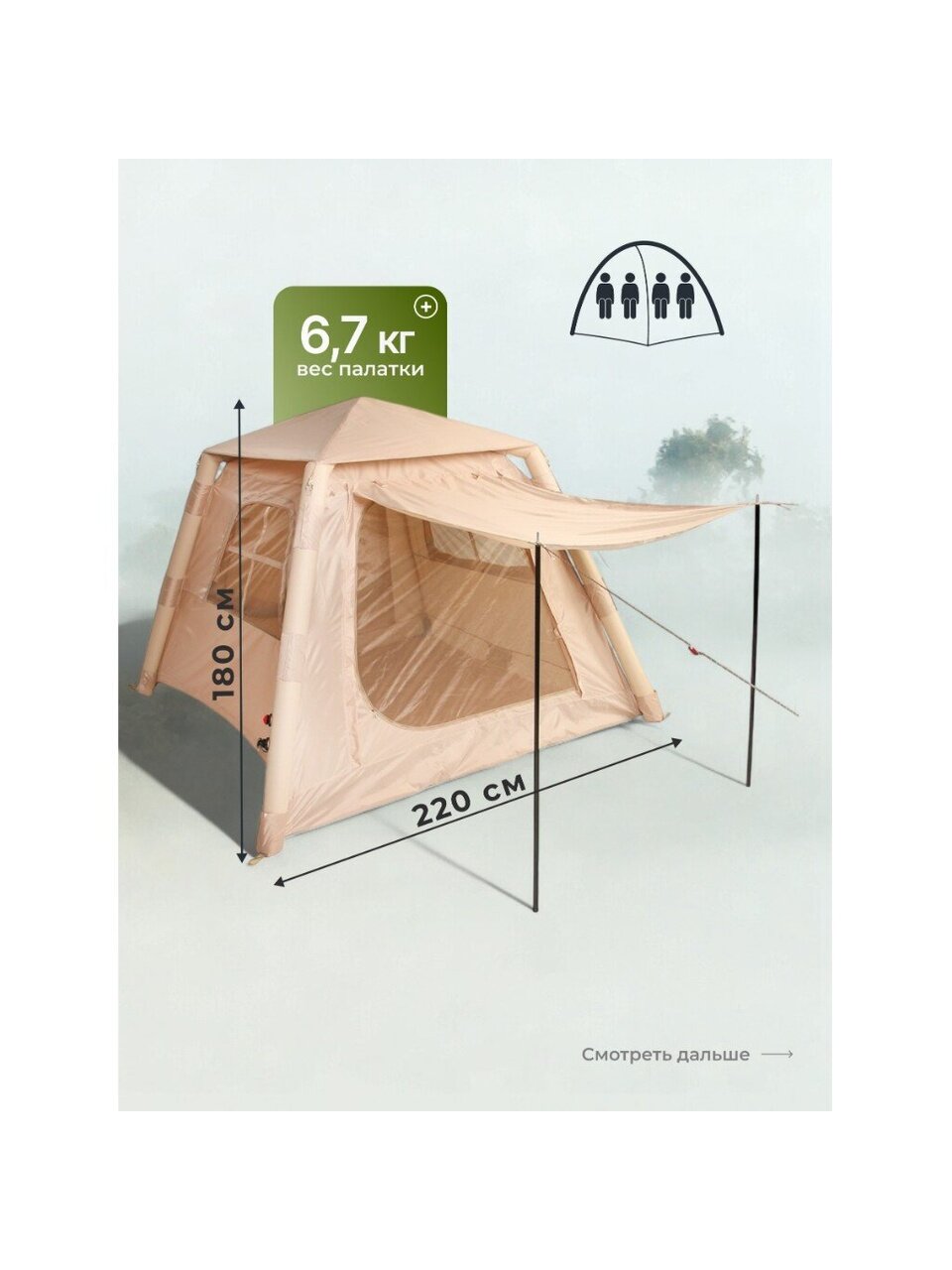 Ткань оксфорд отличается прочностью и износостойкостью, надежно защищая от ветра и осадков. Однослойная конструкция облегчает вес и делает палатку удобной для транспортировки, а надувной каркас гарантирует быструю установку и устойчивость даже при переменчивых погодных условиях. Тамбур создает дополнительное пространство для хранения обуви, снаряжения или багажа, а москитная сетка обеспечивает защиту от насекомых и свежий воздух внутри палатки.