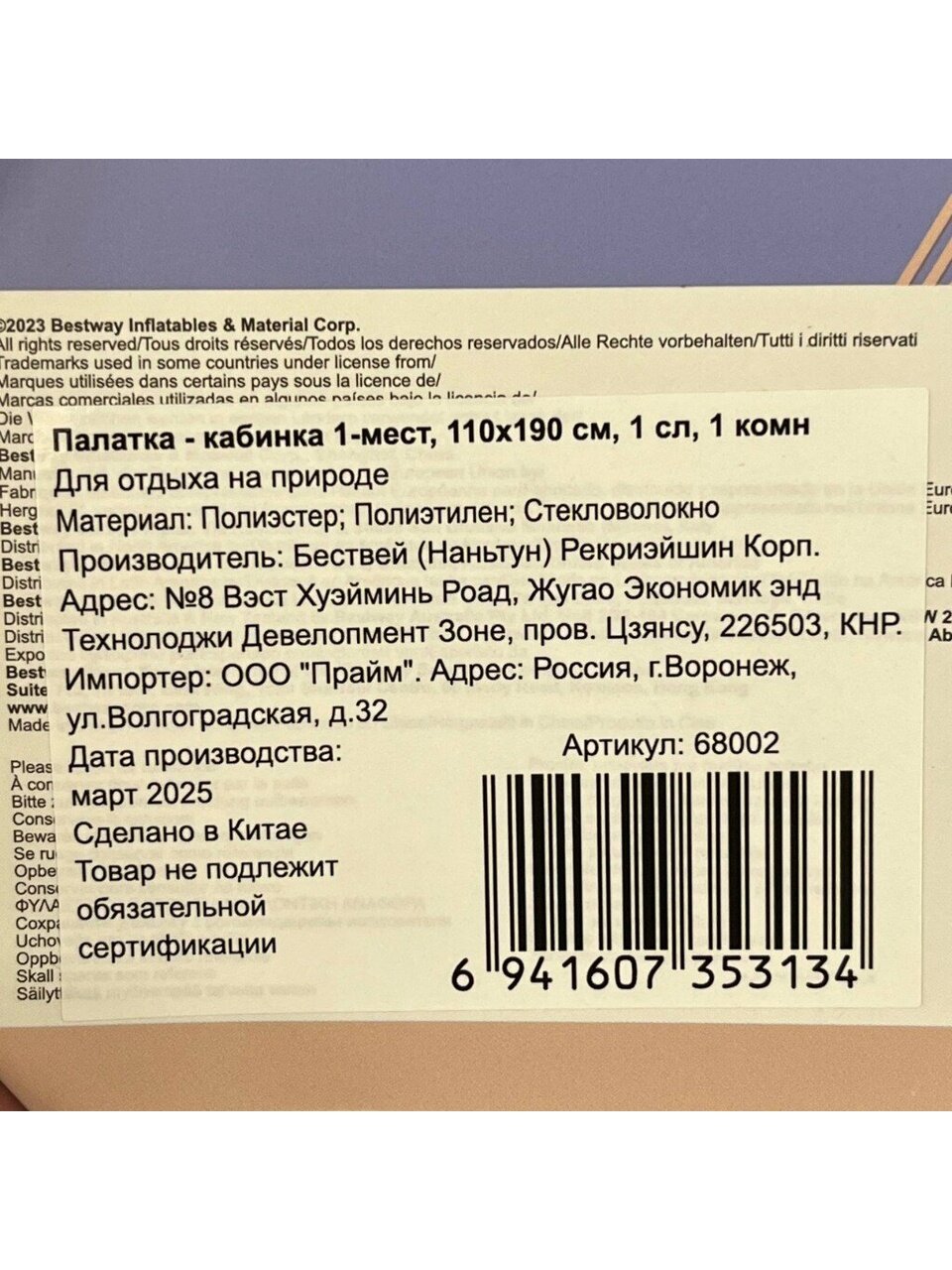 Вы можете приобрести «Палатка - кабинка 1-мест, 110х190 см, 1 слой, 1 комн, Bestway, 68002BW» и другие товары в нашем интернет-магазине в Клинцах по низким ценам и с бесплатным самовывозом.
