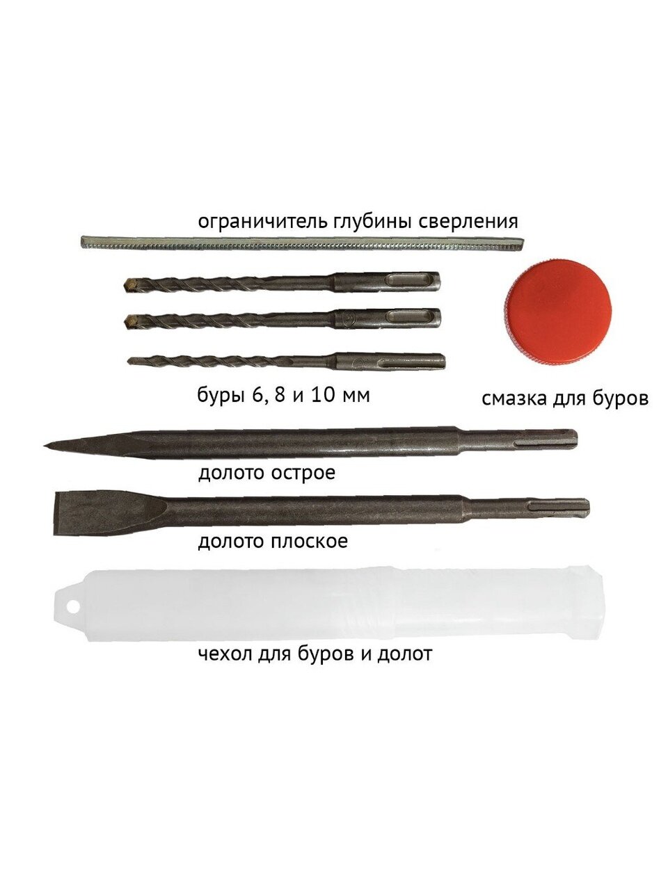 - Широкий набор комплектующих: в комплекте с перфоратором идут буры, долота и смазка для них.