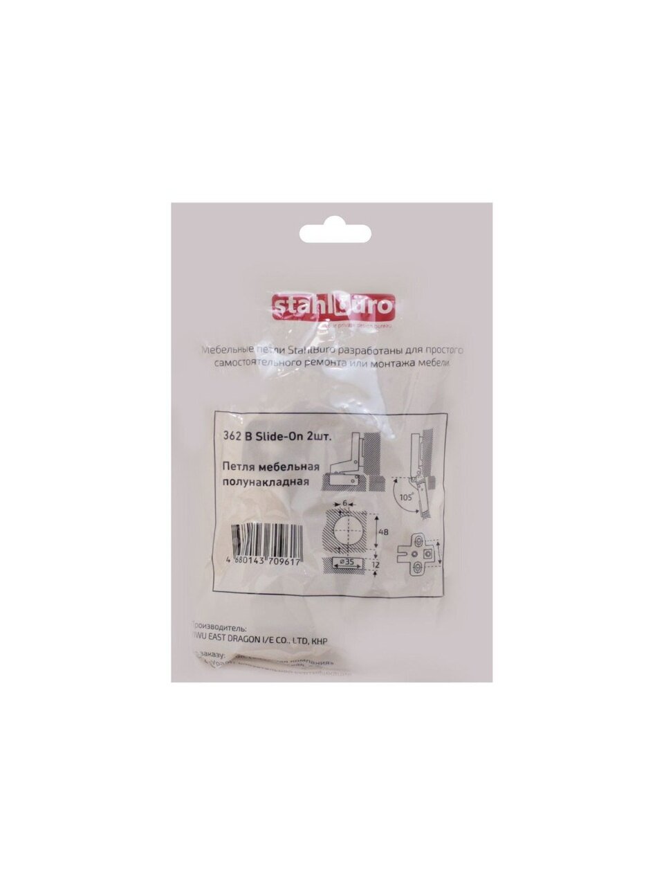 Вы можете приобрести «Петля полунакладная мебельная, StahlBuro, 362 Slide-On, 15 910, 2 штуки, хром» и другие товары в нашем интернет-магазине в Россоши по низким ценам и с бесплатным самовывозом.