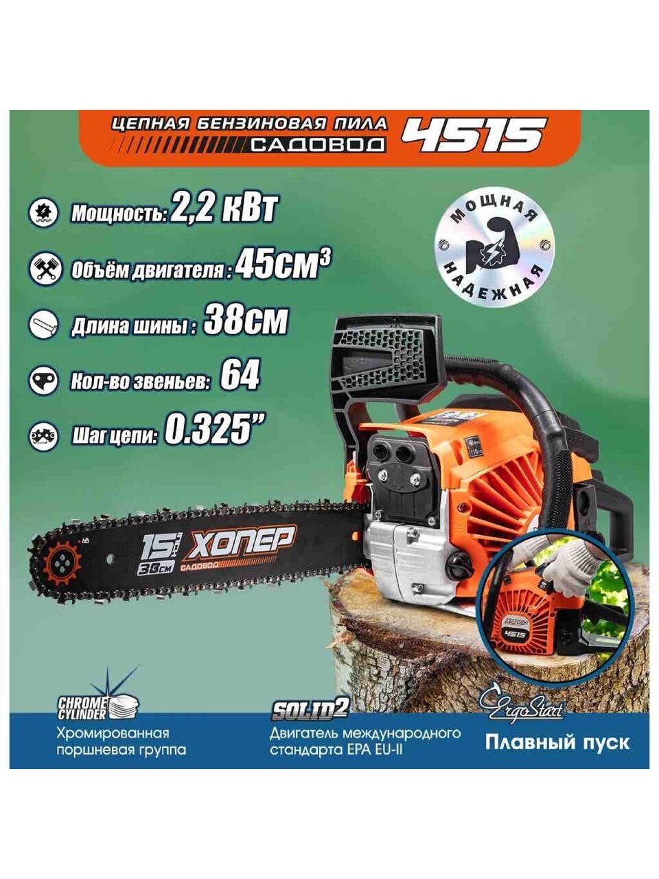 Вы можете приобрести «Пила цепная бензиновая, Хопер, 3 л.с., 2200 Вт, длина шины 38.1 см, шаг цепи 0.325 дюйм, 64 звена, Садовод 4515» и другие товары в нашем интернет-магазине в Таганроге по низким ценам и с бесплатным самовывозом.