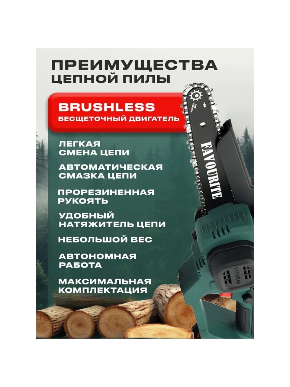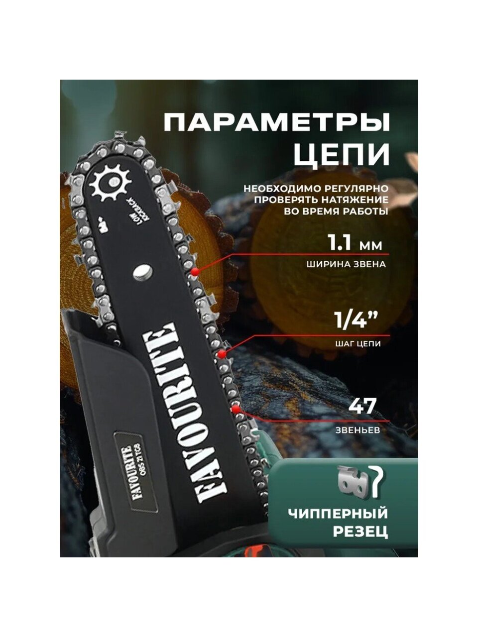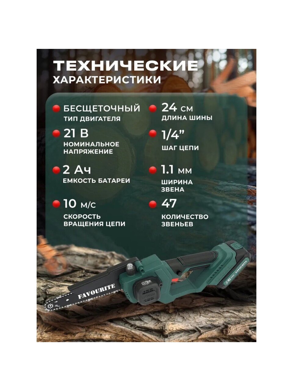Пила цепная аккумуляторная Favourite OBS 21 TG8 — компактное и эффективное решение для быстрой и удобной обработки древесины на участке, в саду или при строительстве. Легкая конструкция и продуманная эргономика позволяют работать одной рукой, что особенно важно при длительных задачах и в труднодоступных местах. Современный бесщеточный электродвигатель обеспечивает высокую производительность и длительный срок службы, а литий-ионный аккумулятор на 21 В гарантирует стабильную работу без привязки к розетке.
