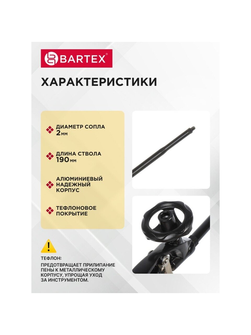 Пистолет для монтажной пены Bartex – это идеальный инструмент для быстрого, безопасного и точного заполнения щелей и пустот даже в труднодоступных местах. С помощью винта Вы сможете регулировать объем и скорость выхода пены. Эта удобная опция позволит Вам сократить время работ и избежать перерасхода материала. Эргономичная форма изделия и легкий пуск курка обеспечивают надежный и удобный захват, не давая Вашим рукам устать даже при длительной нагрузке.