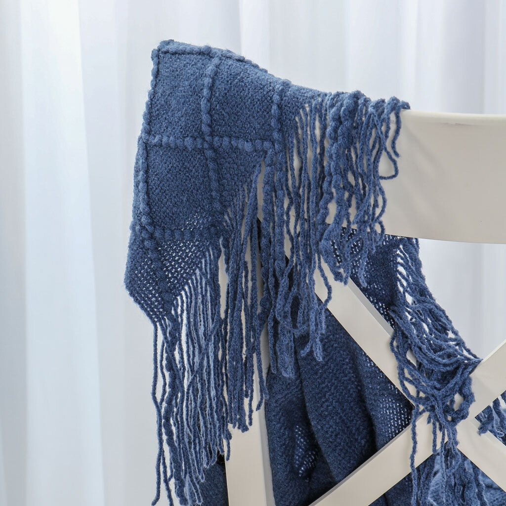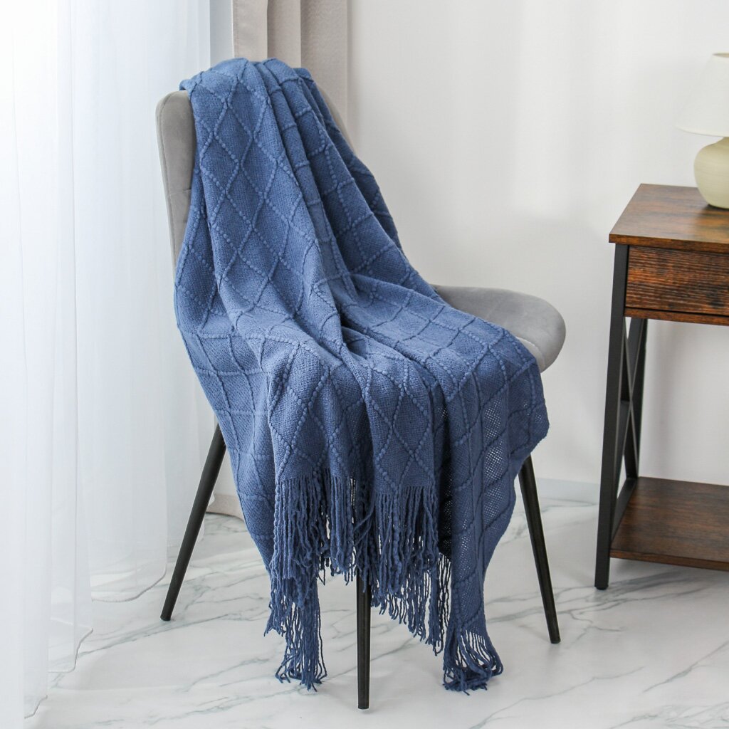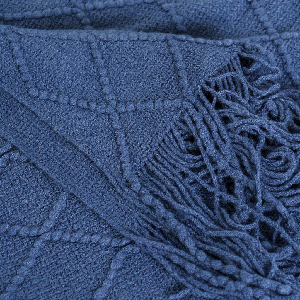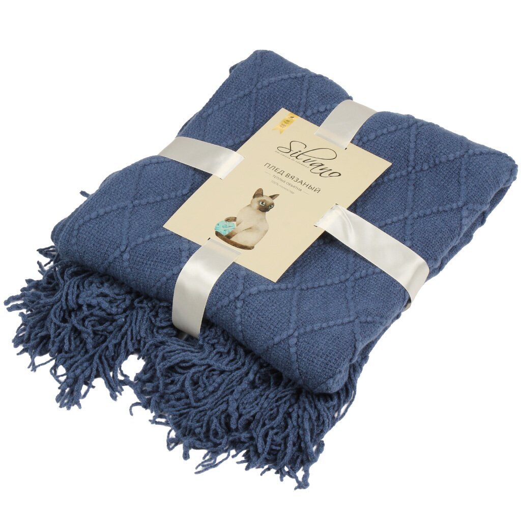 - Уникальное предложение: плотный вязаный плед с бахромой, сочетающий трендовый тёмно-синий цвет и универсальность для любого интерьера.