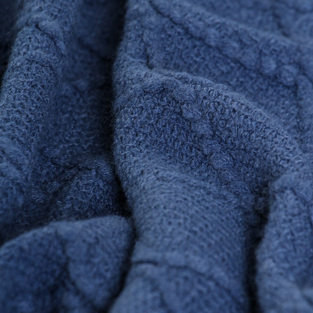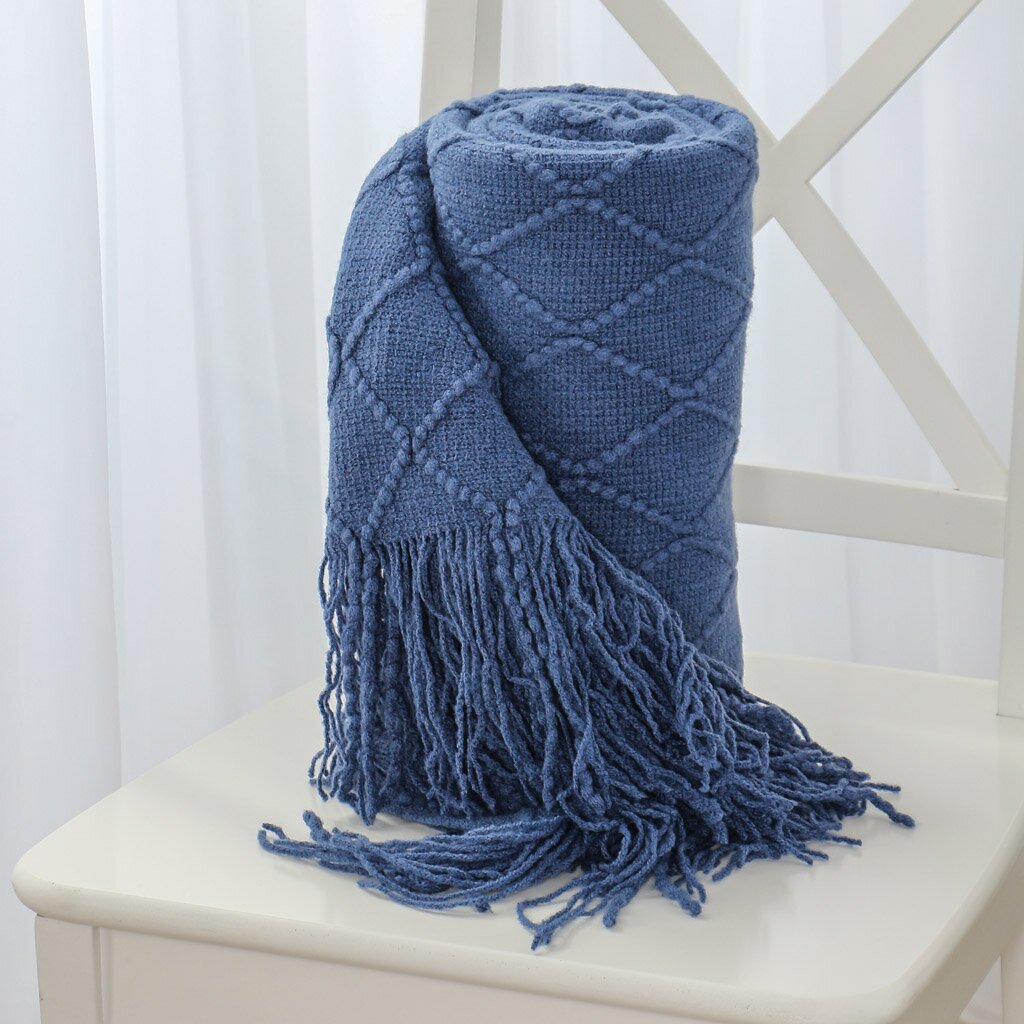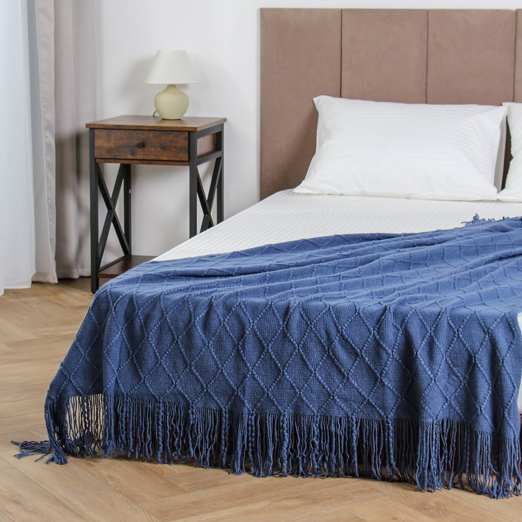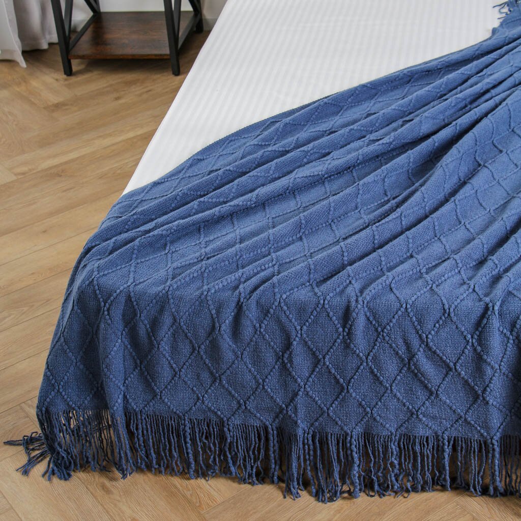 - Уникальное предложение: плотный вязаный плед с бахромой, сочетающий трендовый тёмно-синий цвет и универсальность для любого интерьера.