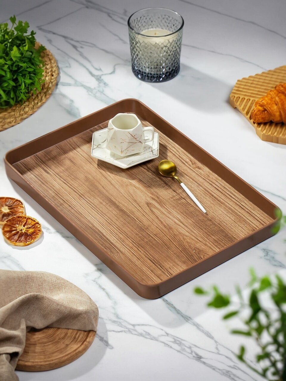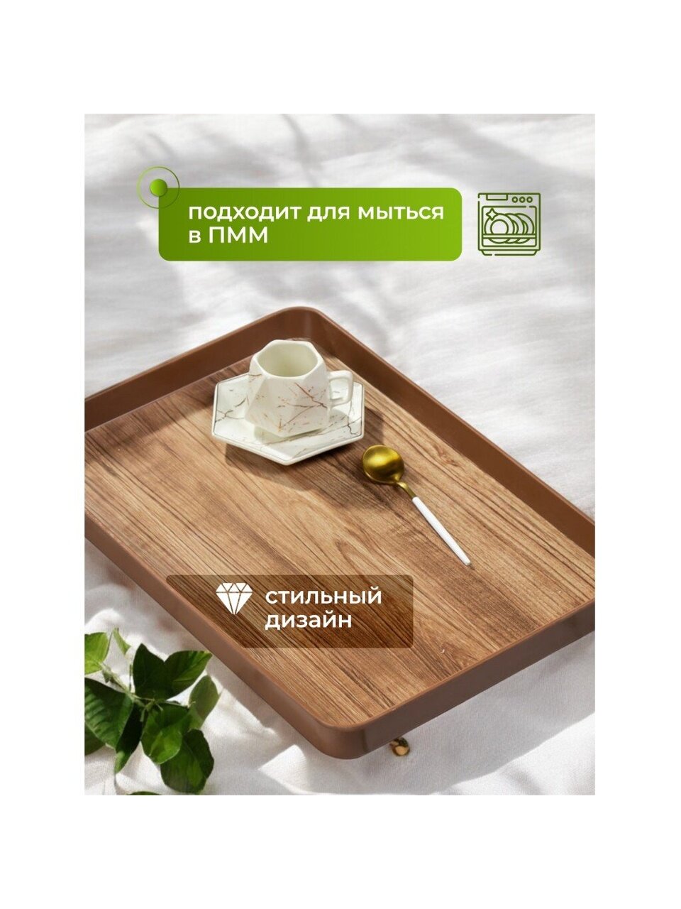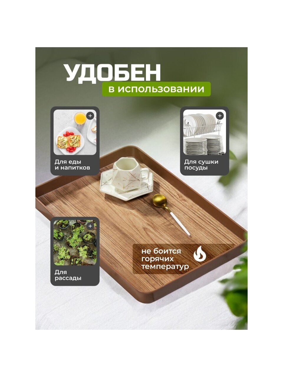 Поднос - это функциональный и стильный аксессуар для сервировки стола и стилизации домашнего пространства. Поднос можно использовать в качестве подставки под горячее. Он не боится высоких температур.
