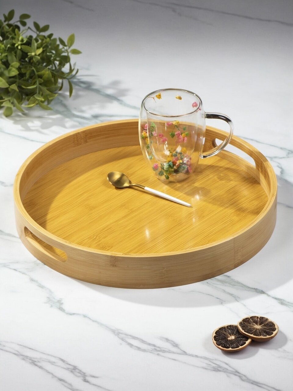 Бамбуковый поднос Y4-8886 — это универсальное решение для сервировки чая, кофе или любых других напитков и закусок. Благодаря круговой форме и удобным ручкам, поднос легко использовать как в домашних условиях, так и на открытом воздухе. Его диаметр в 35 см позволяет разместить на нём всё необходимое для уютного чаепития или романтического ужина на двоих. Простой, но стильный дизайн без рисунков делает его подходящим для любого стиля интерьера.