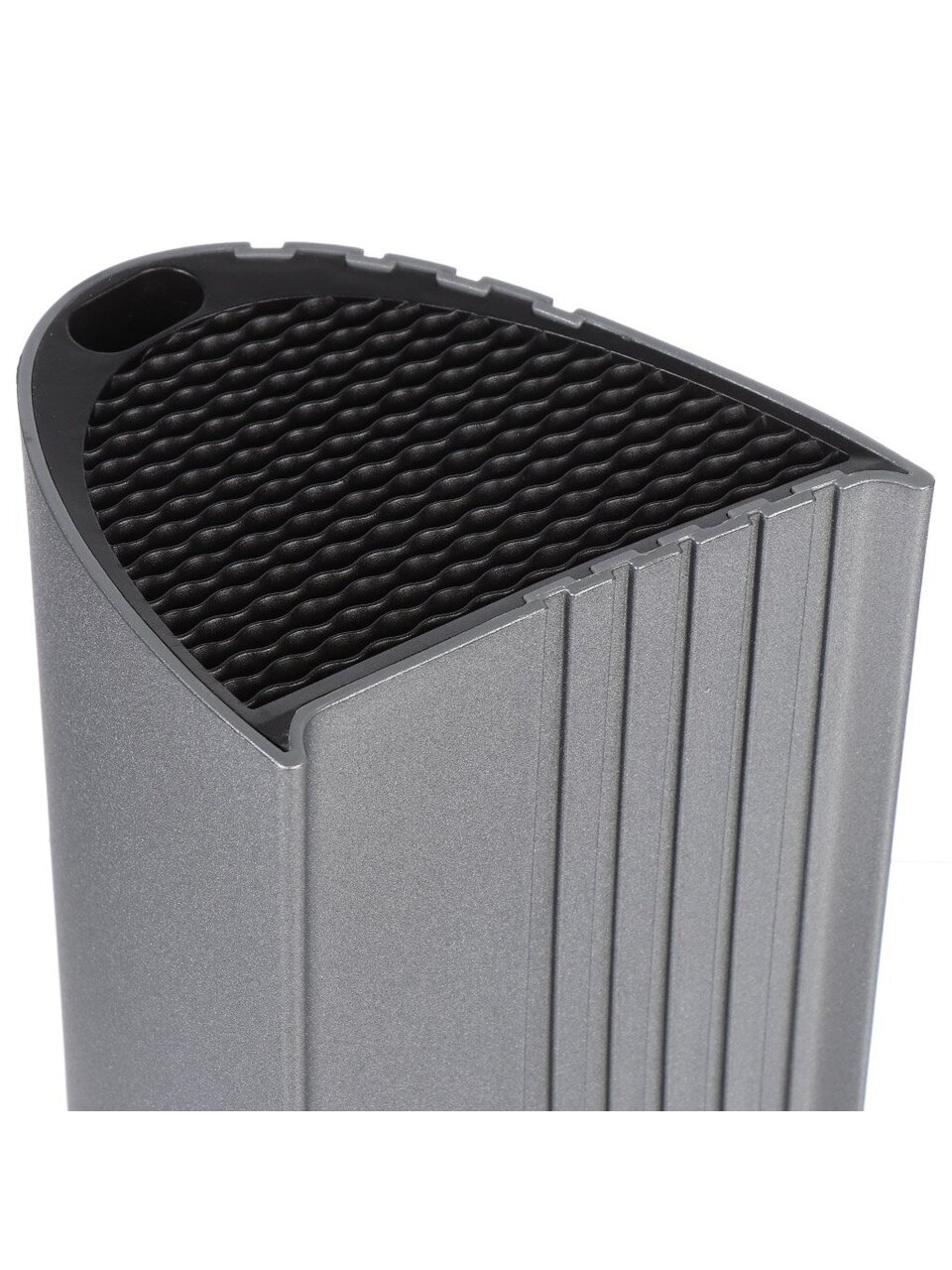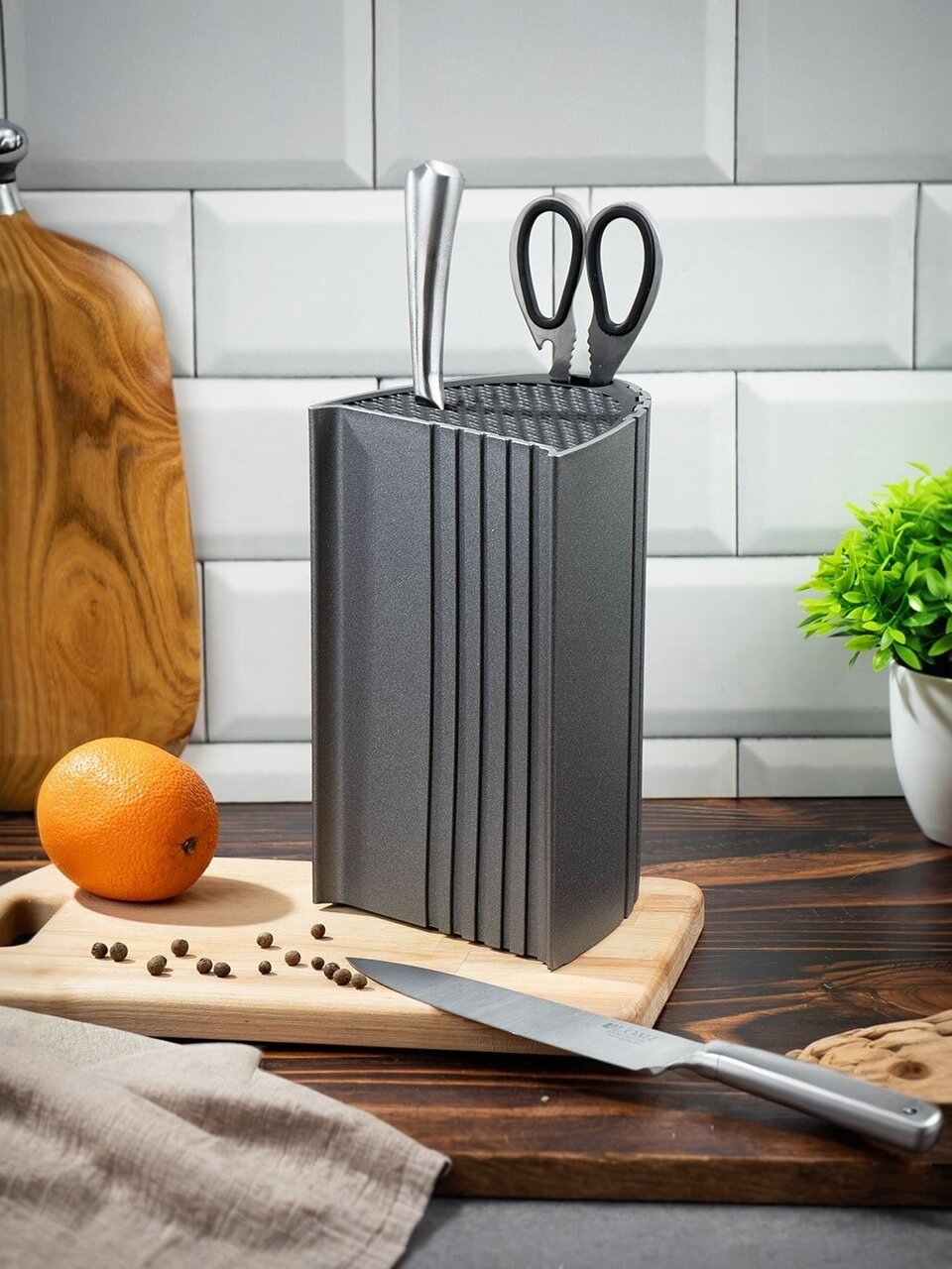 - Конструкция подставки разработана таким образом, чтобы вмещать ножи и другие кухонные принадлежности любых размеров и материалов - от традиционных металлических до современных керамических.