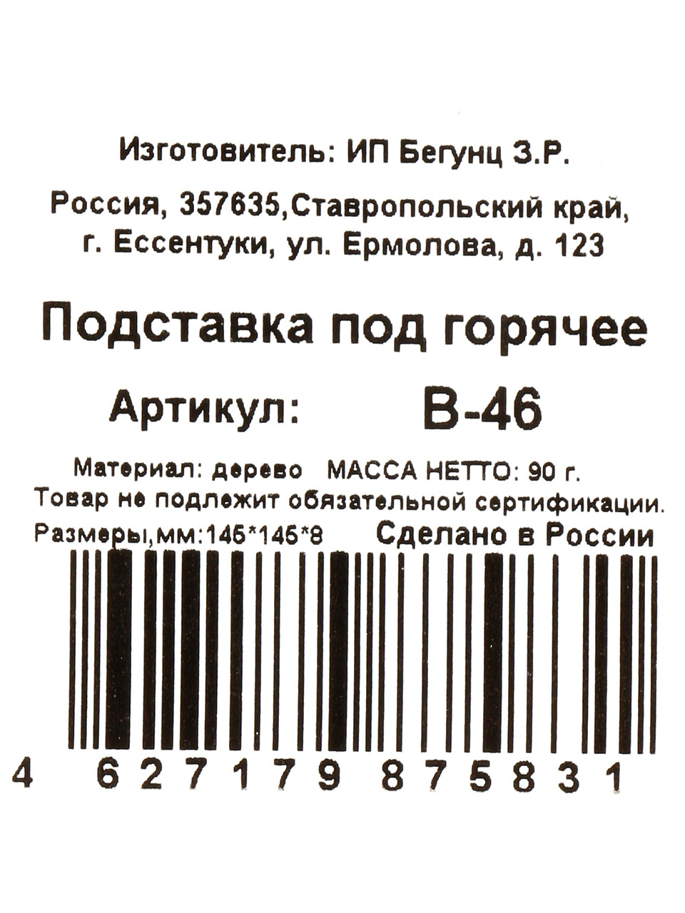 Обратите внимание на материал (дерево, массив), толщину (8 мм) и размеры (14.5х14.5 см). Квадратная форма универсальна для разных типов посуды.