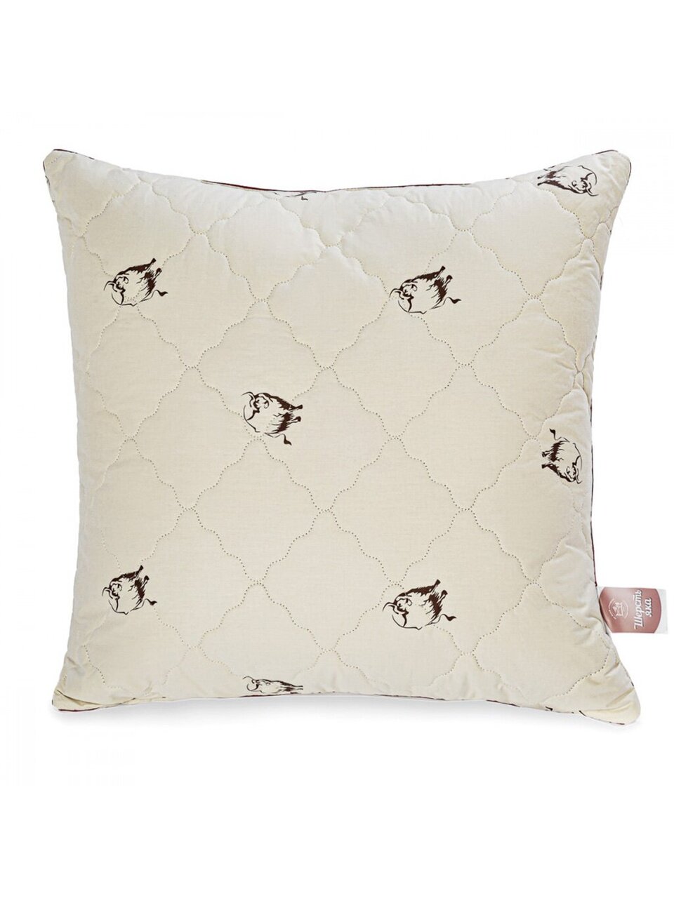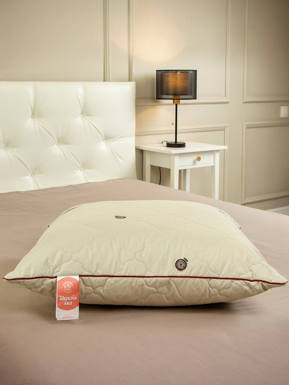 Кремовый чехол из хлопка с набивным логотипом яка простёган и хорошо переносит чистку. Подушки с наполнителем из шерсти обеспечивают комфортный сон в тепле и спокойствии.