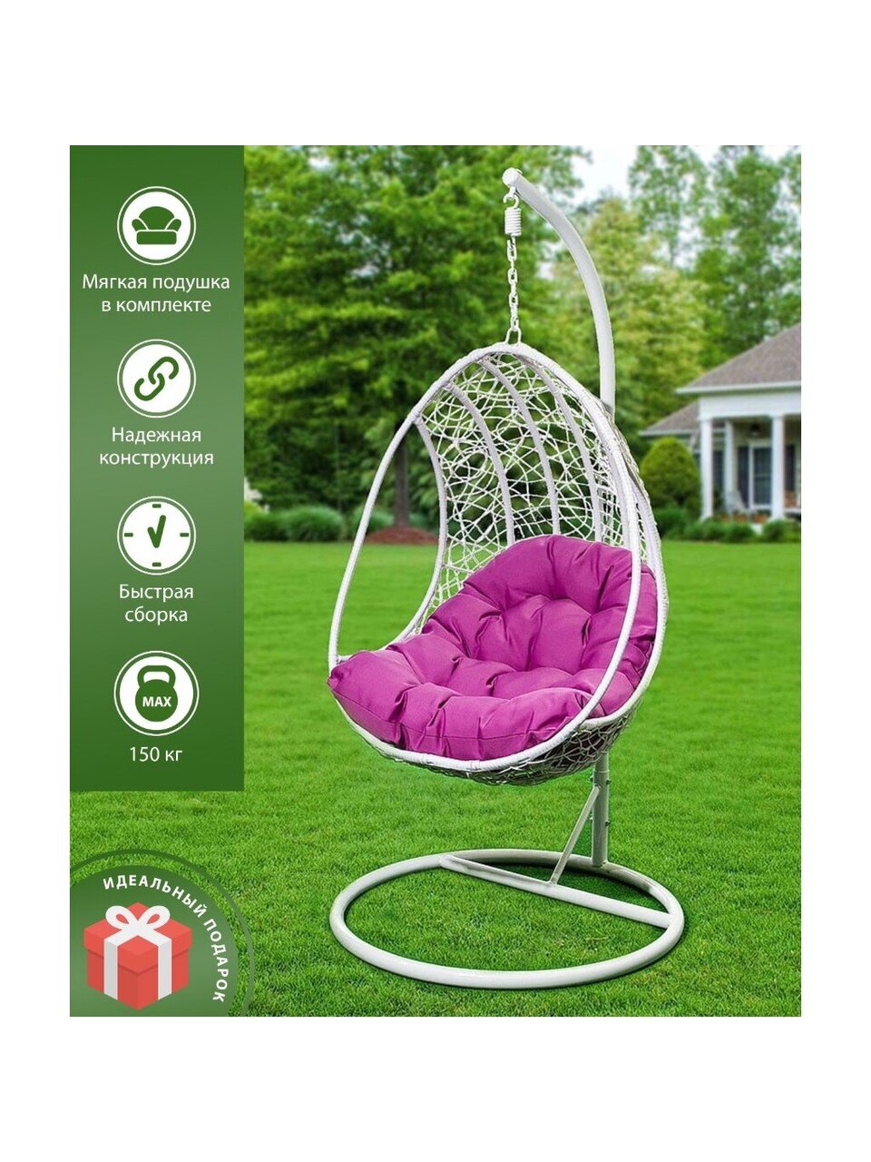 Вы можете приобрести «Подвесное кресло Кокон, 1-мест, 63х87х195 см, 150 кг, Green Days, белое, ротанг, подушка фиолетовая» и другие товары в нашем интернет-магазине в Серпухове по низким ценам и с бесплатным самовывозом.