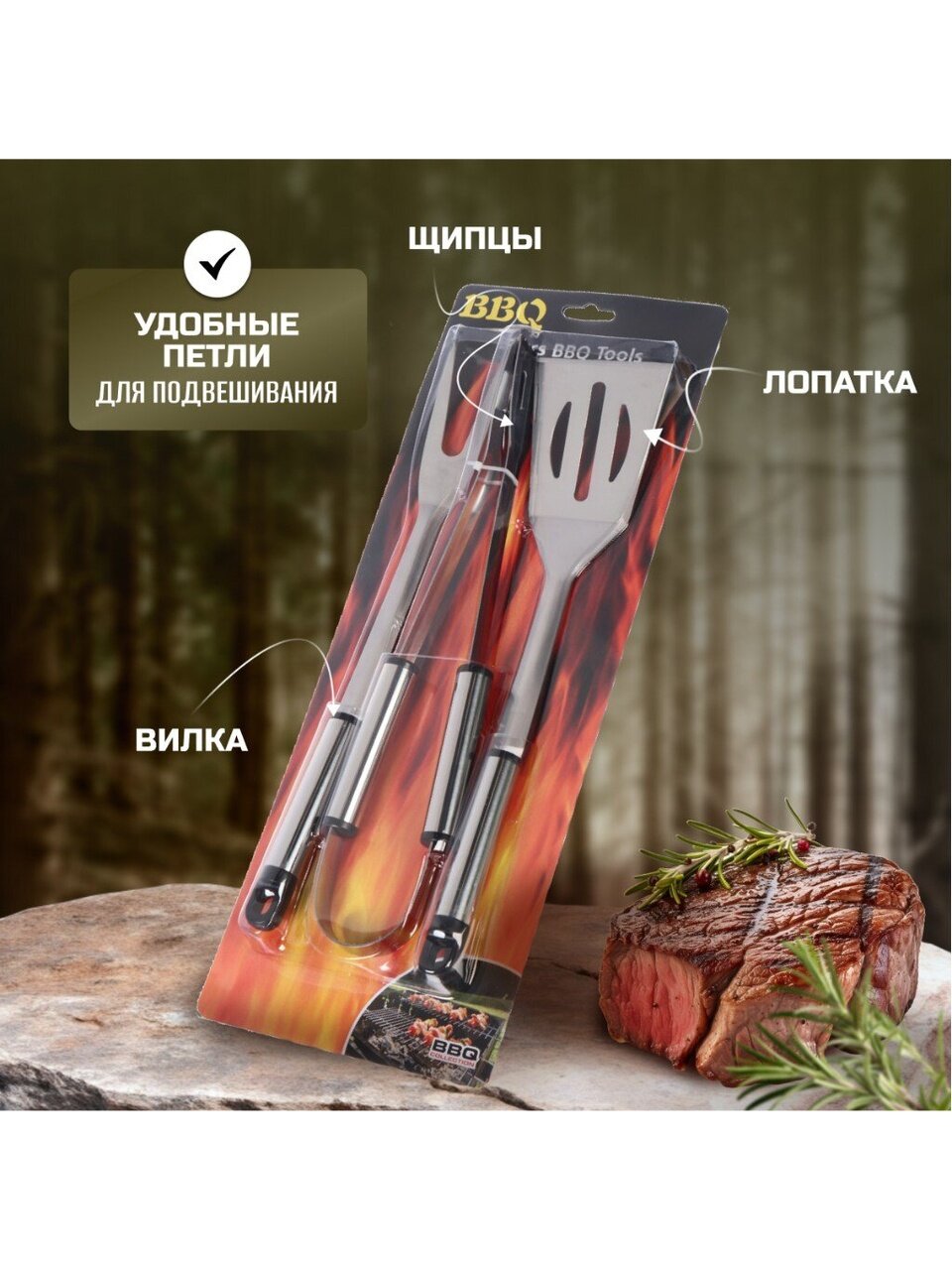 - Состав набора: лопатка, щипцы, вилка для гриля.