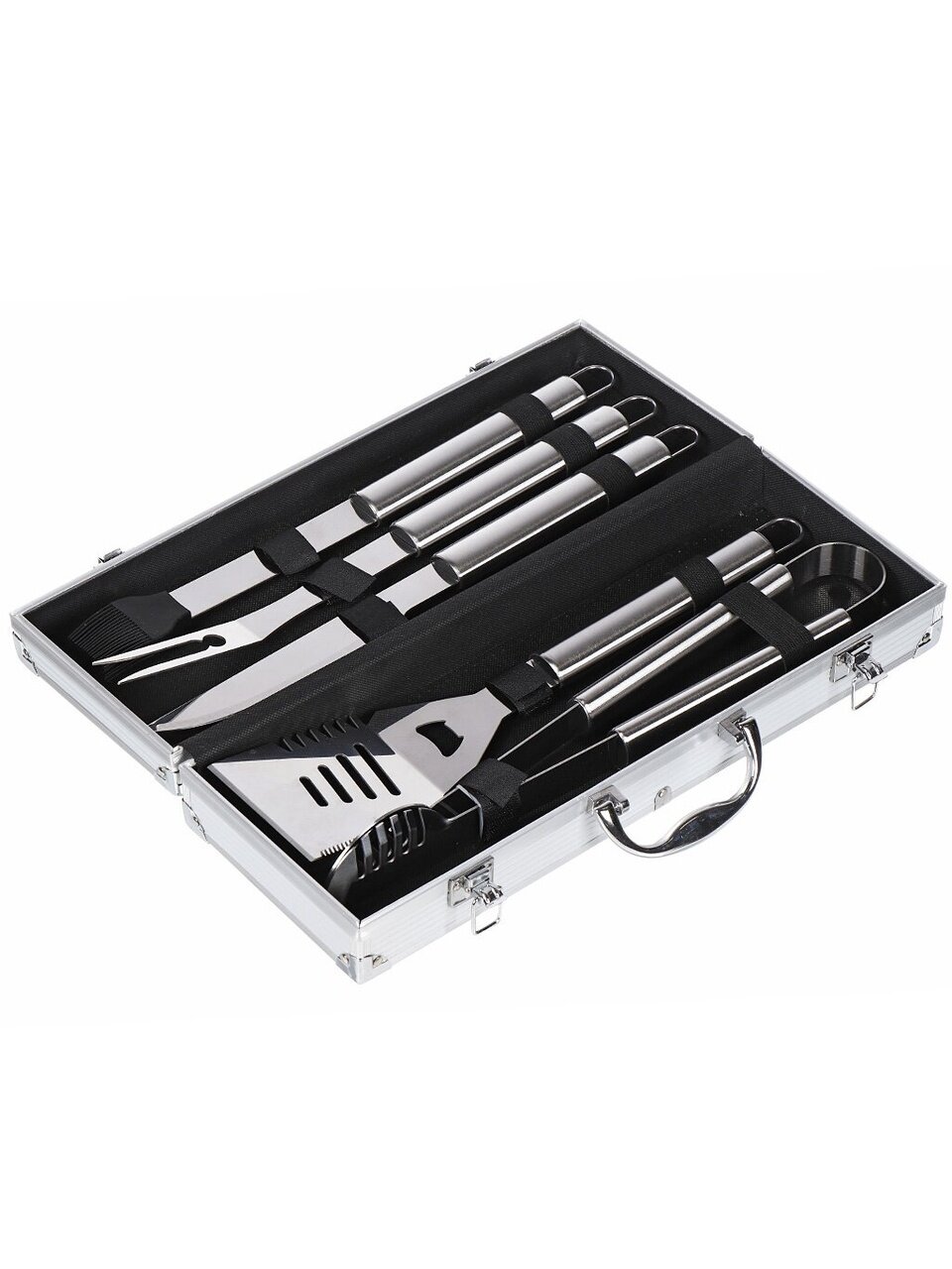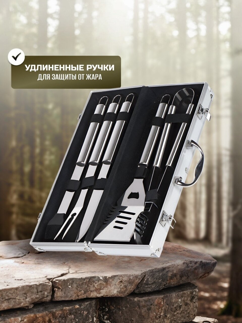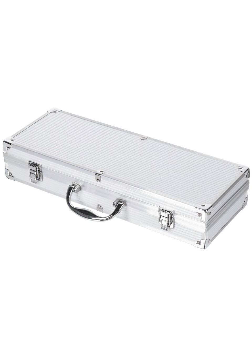 - Серебристый цвет придаёт набору для барбекю элегантность и современность, что делает его идеальным для любого пикника или вечеринки на открытом воздухе.
