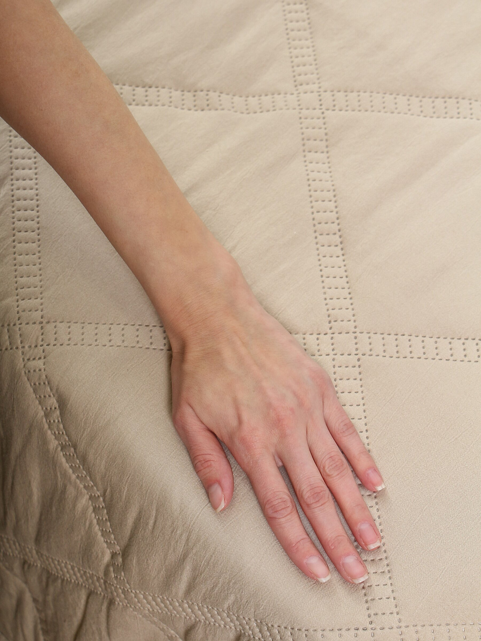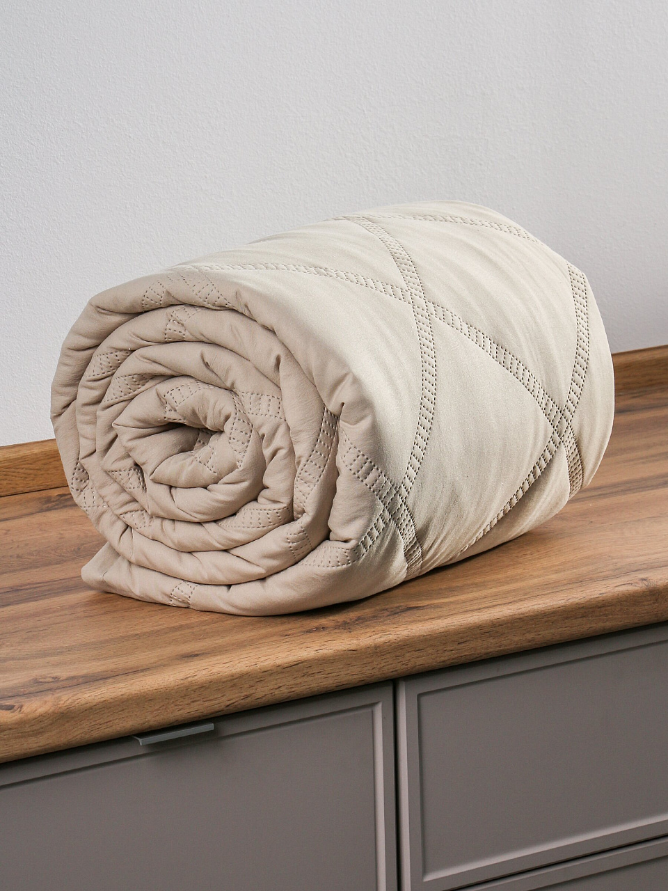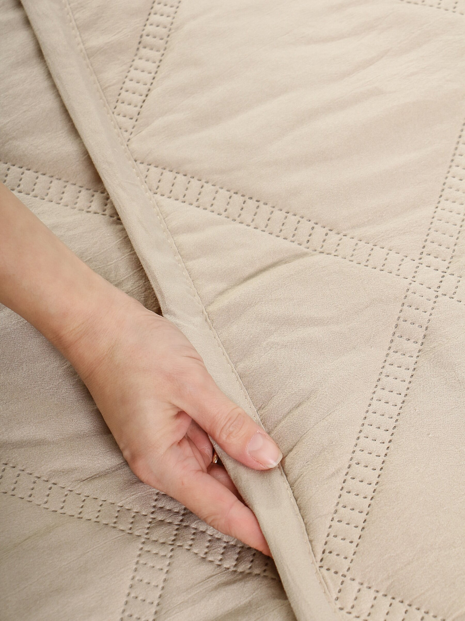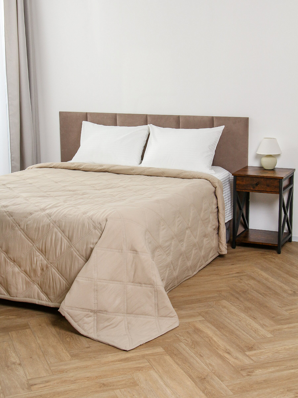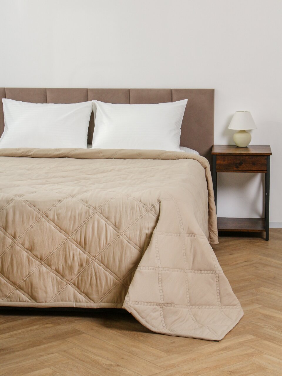 - Современный дизайн: однотонное стеганое покрывало в трендовом бежевом цвете гармонично впишется в любой интерьер.