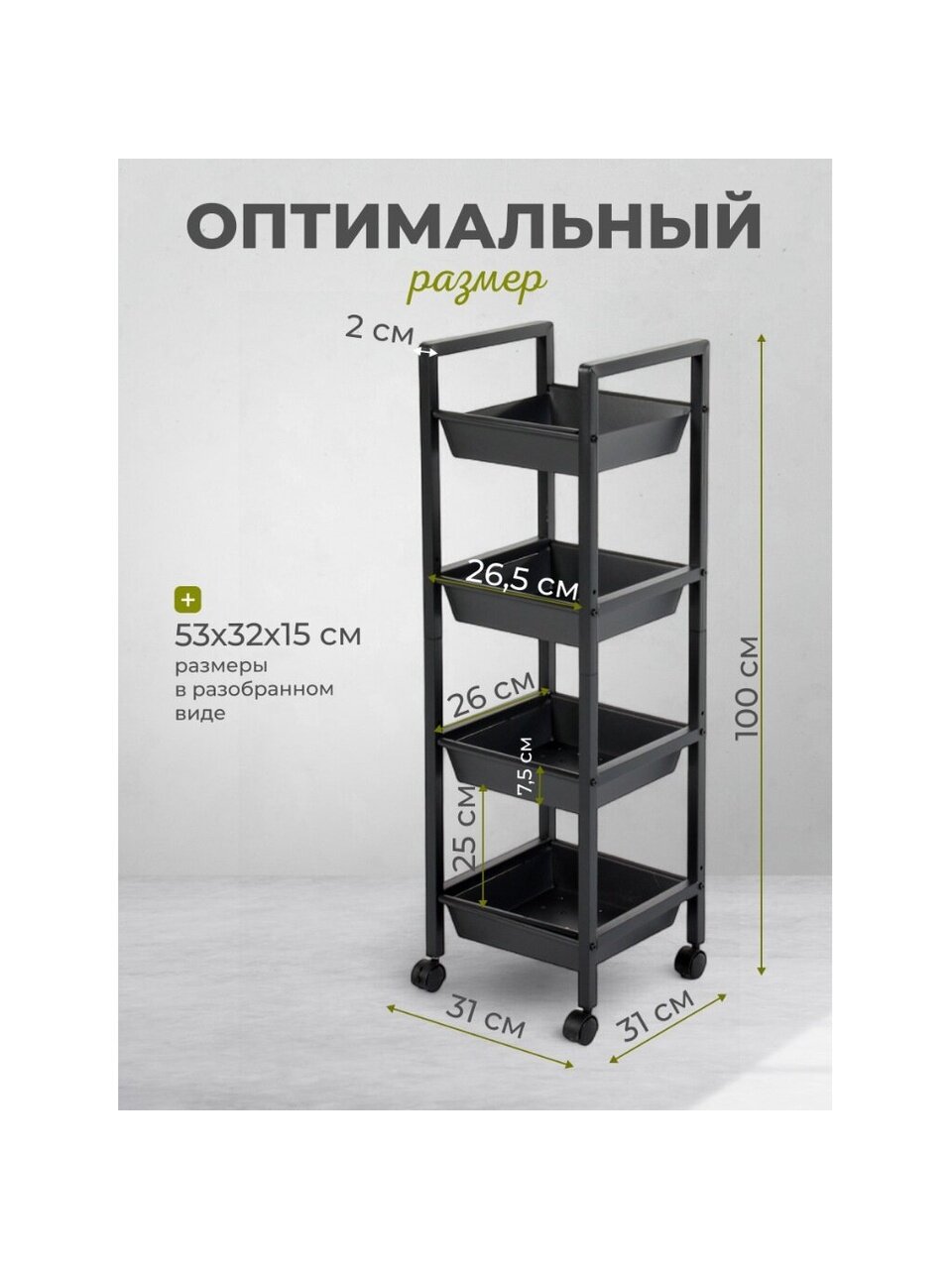 Металлическая этажерка с четырьмя секциями — оптимальный выбор для хранения книг, аксессуаров, бытовых принадлежностей, посуды или текстиля. Благодаря размерам 31х31х100 см, конструкция не занимает много места, но при этом вмещает необходимое количество вещей. Легко поддерживать чистоту: гладкая поверхность металла устойчива к загрязнениям и не требует особого ухода. Эргономичная форма обеспечивает удобство использования и легкий доступ к содержимому каждой секции.
