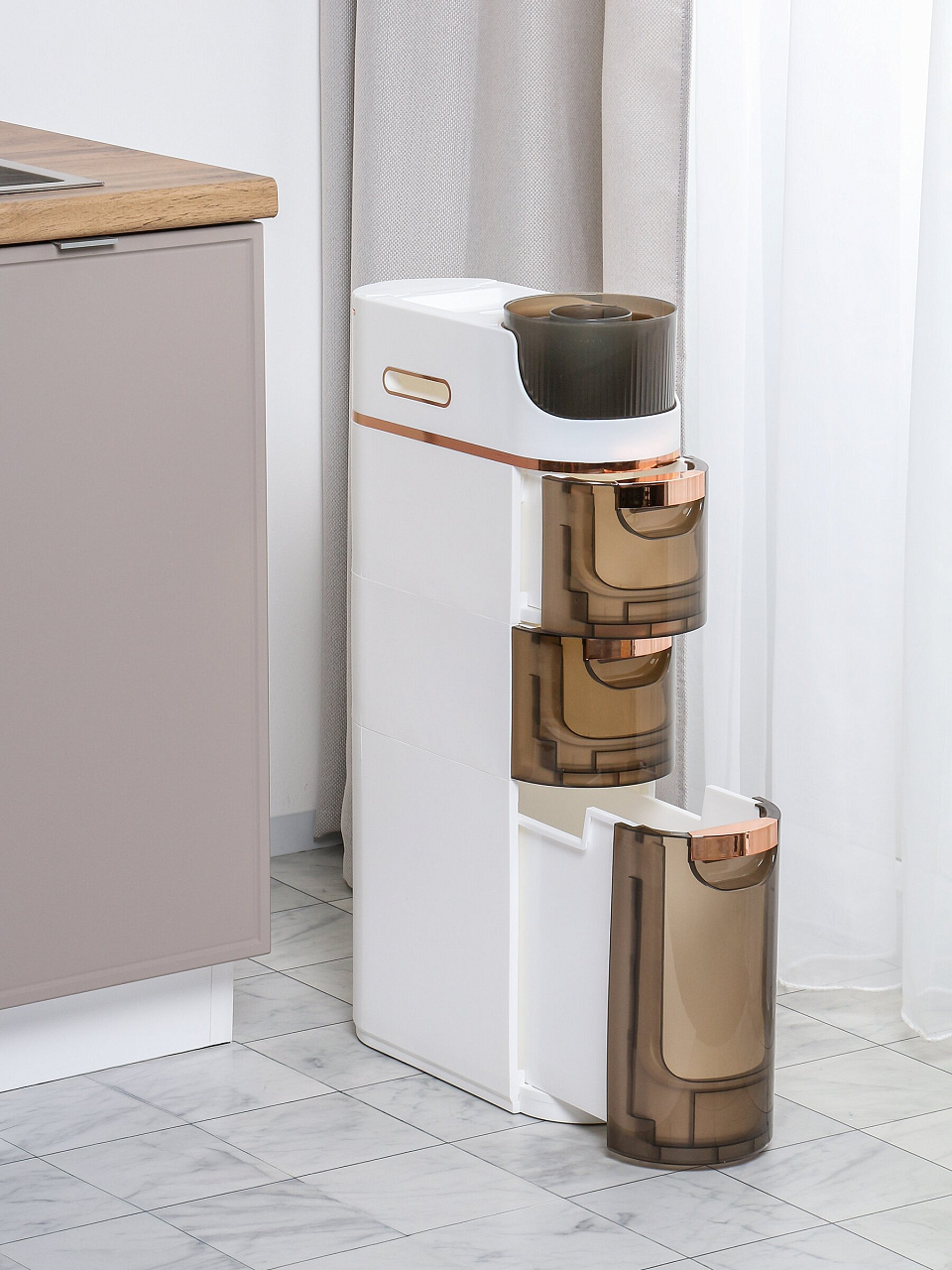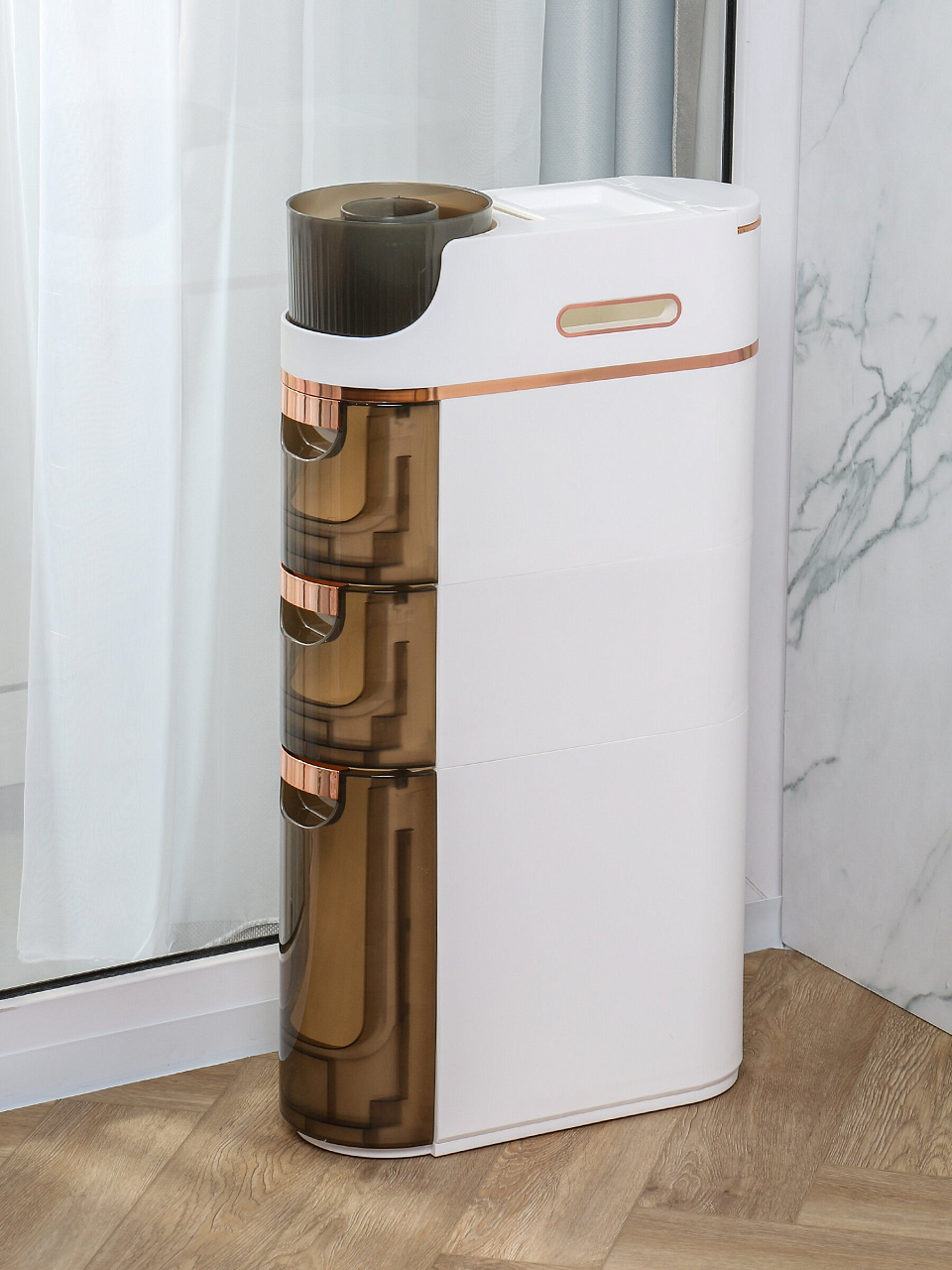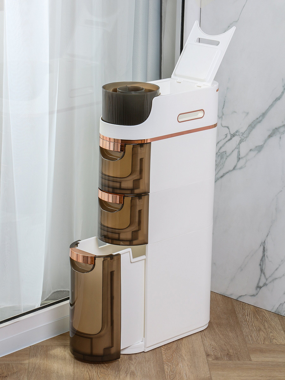 - Уникальный формат: напольный органайзер легко вписывается в узкие пространства, позволяя рационально использовать площадь ванной.