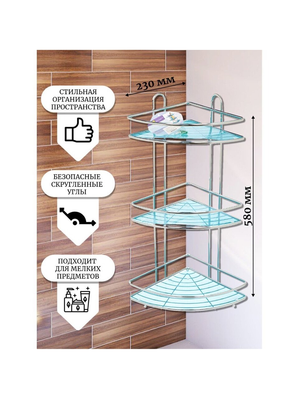 Стальная полка отличается прочностью и долговечностью, что особенно важно для помещений с повышенной влажностью. Размер 58х23 см делает модель универсальной для размещения в различных по площади ванных комнатах. Благодаря продуманной конструкции, полка легко монтируется в угол, освобождая полезное пространство и делая хранение максимально удобным. Хромированный цвет добавляет эстетики и легко сочетается с сантехникой и аксессуарами.