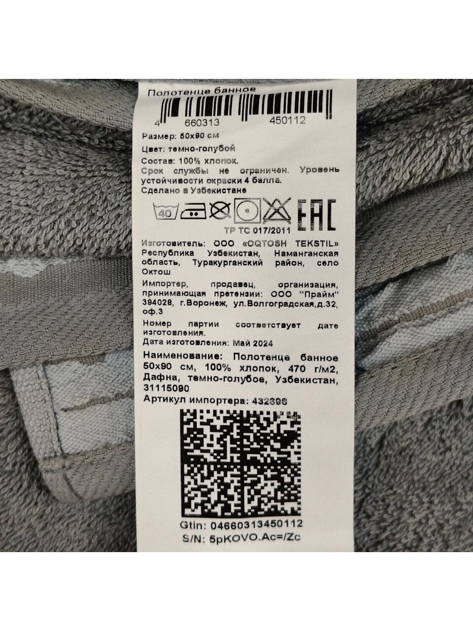 Вы можете приобрести «Полотенце банное 50х90 см, 100% хлопок, 470 г/м2, Дафна, темно-голубое, Узбекистан, 31115090» и другие товары в нашем интернет-магазине в Казани по низким ценам и с бесплатным самовывозом.