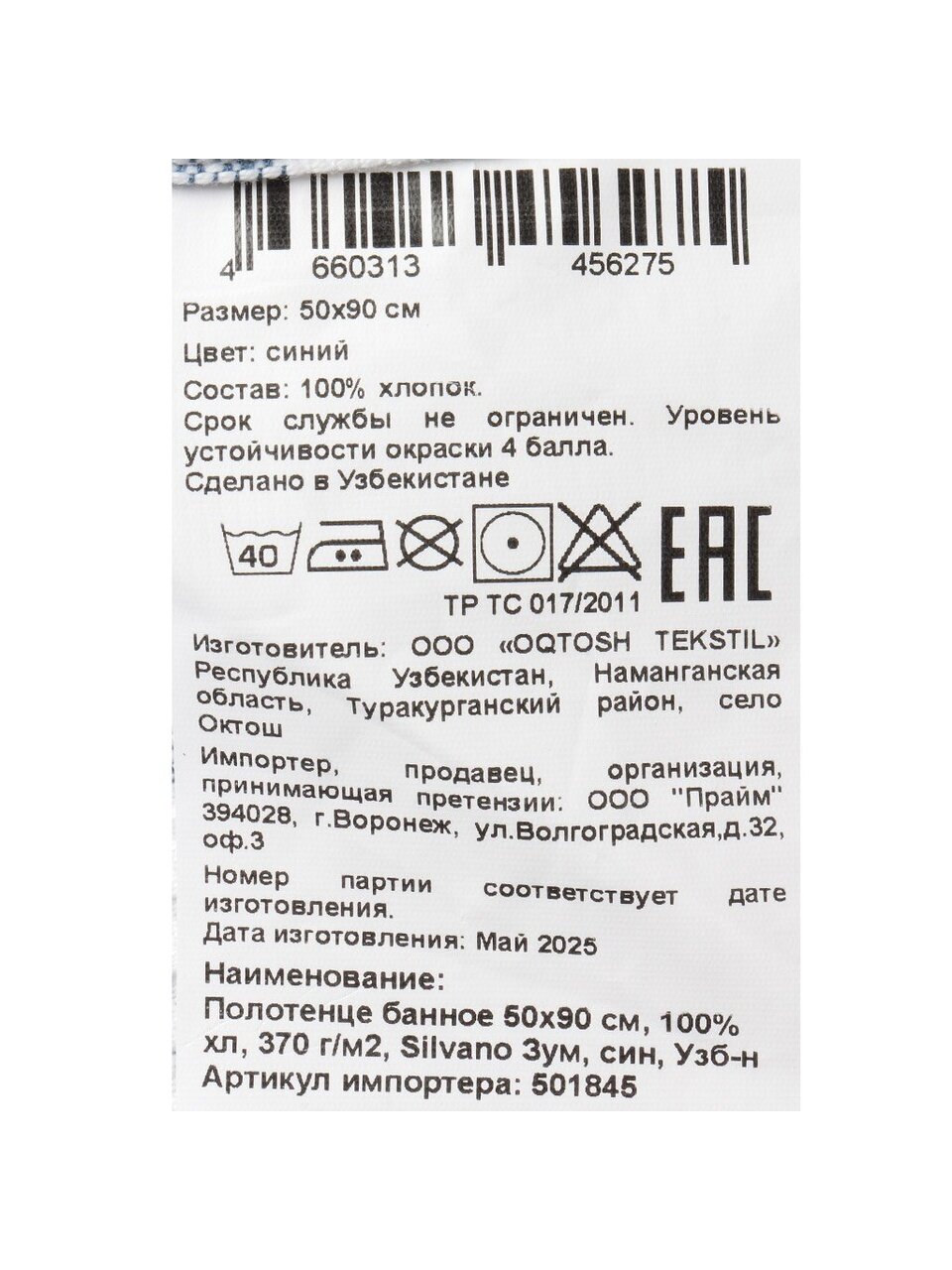 Вы можете приобрести «Полотенце банное 50х90 см, 100% хлопок, 370 г/м2, Зум, Silvano, синее, Узбекистан» и другие товары в нашем интернет-магазине в Астрахани по низким ценам и с бесплатным самовывозом.