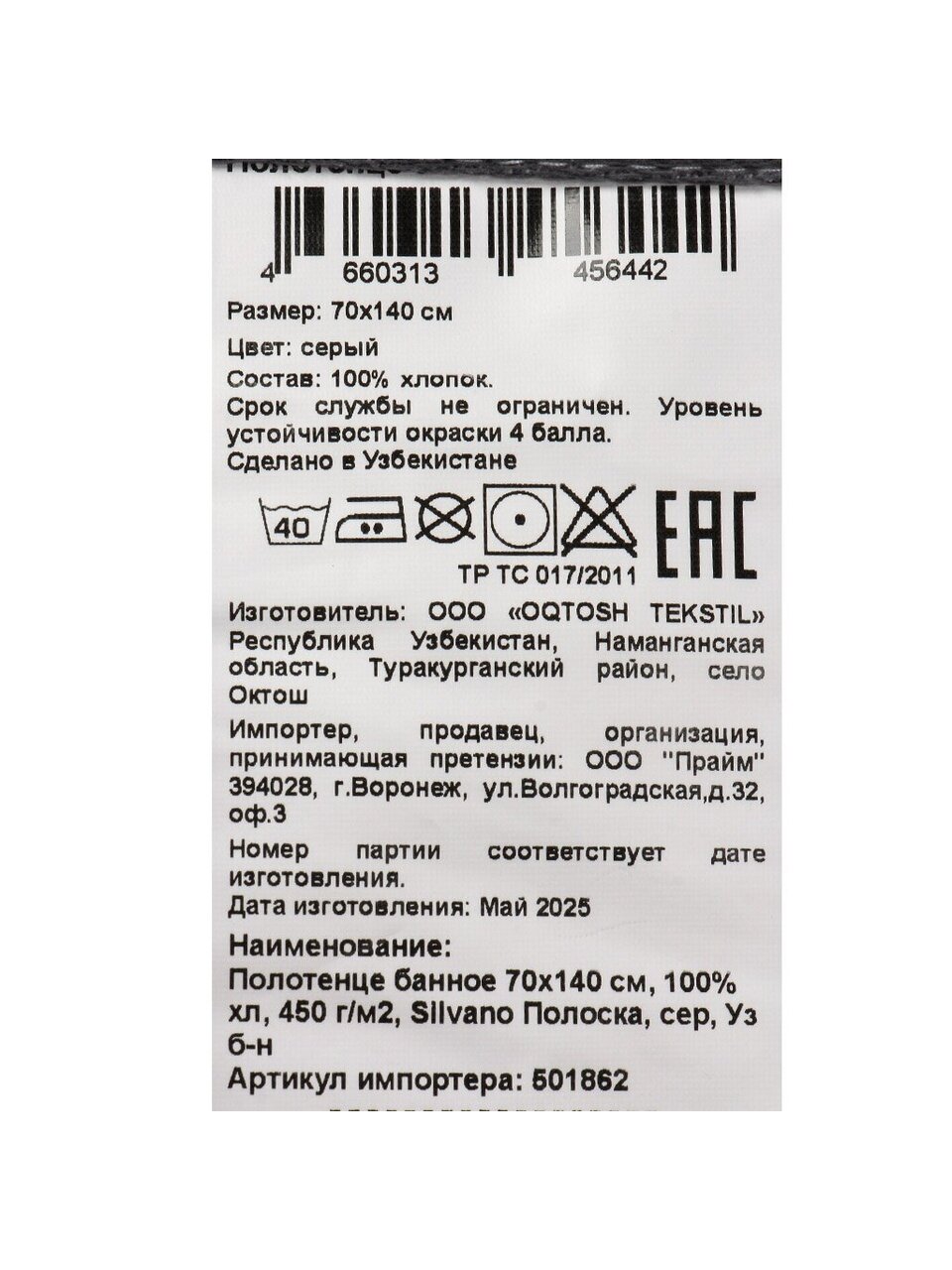 Вы можете приобрести «Полотенце банное 70х140 см, 100% хлопок, 450 г/м2, Полоска, Silvano, серое, Узбекистан» и другие товары в нашем интернет-магазине в Серпухове по низким ценам и с бесплатным самовывозом.