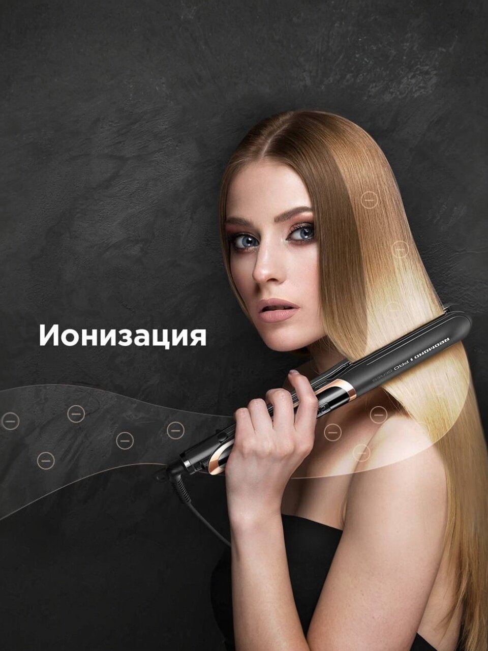 Выпрямитель оснащен мощностью в 50 Вт и керамическим покрытием, что обеспечивает бережное выпрямление без повреждения волос. Керамические пластины равномерно распределяют тепло, предотвращая перегрев и сохраняя здоровье волос. Дополнительная функция ионизации помогает избежать статического электричества, делая волосы более послушными и придавая им естественный блеск.