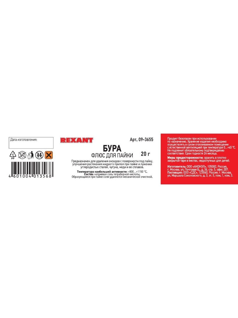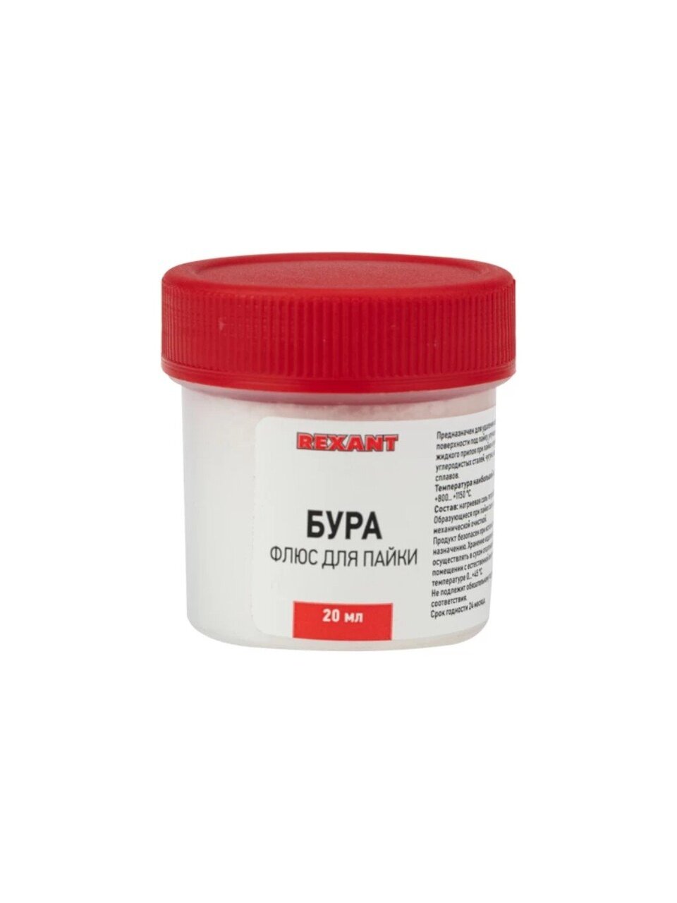 Флюс для пайки REXANT БУРА 20 г — идеальное решение для работы с нержавеющей и жаропрочной сталью, чугуном и медью. Применяется также в ювелирном деле для растворения окислов металлов и тщательной очистки поверхностей перед пайкой. Температура пайки: +700...+900 °C. Состав: натриевая соль тетраборной кислоты. После пайки рабочая поверхность промывается горячей водой.