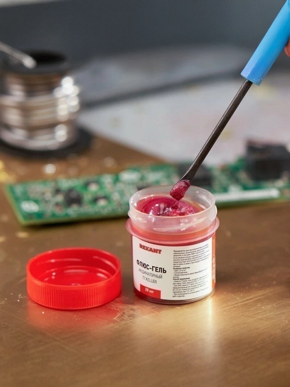 Флюс-гель для пайки TT KELLER индикаторный 20 мл REXANT 09-3692 — идеальное решение для высококачественной пайки электронных компонентов, радиотехнических изделий и посадки SMD-компонентов. Подходит для пайки практически всех металлов и сплавов, что обеспечивает универсальность применения в домашних условиях и на даче. Благодаря красному индикатору активности можно легко контролировать процесс пайки: после завершения работы индикатор обесцвечивается, подтверждая отсутствие активного компонента. Температура наибольшей активности +170...+250 ℃ гарантирует надежный результат. В составе только эффективные компоненты: вазелин технический, тетраэтиленгликоль, эмульгатор и термокраситель.