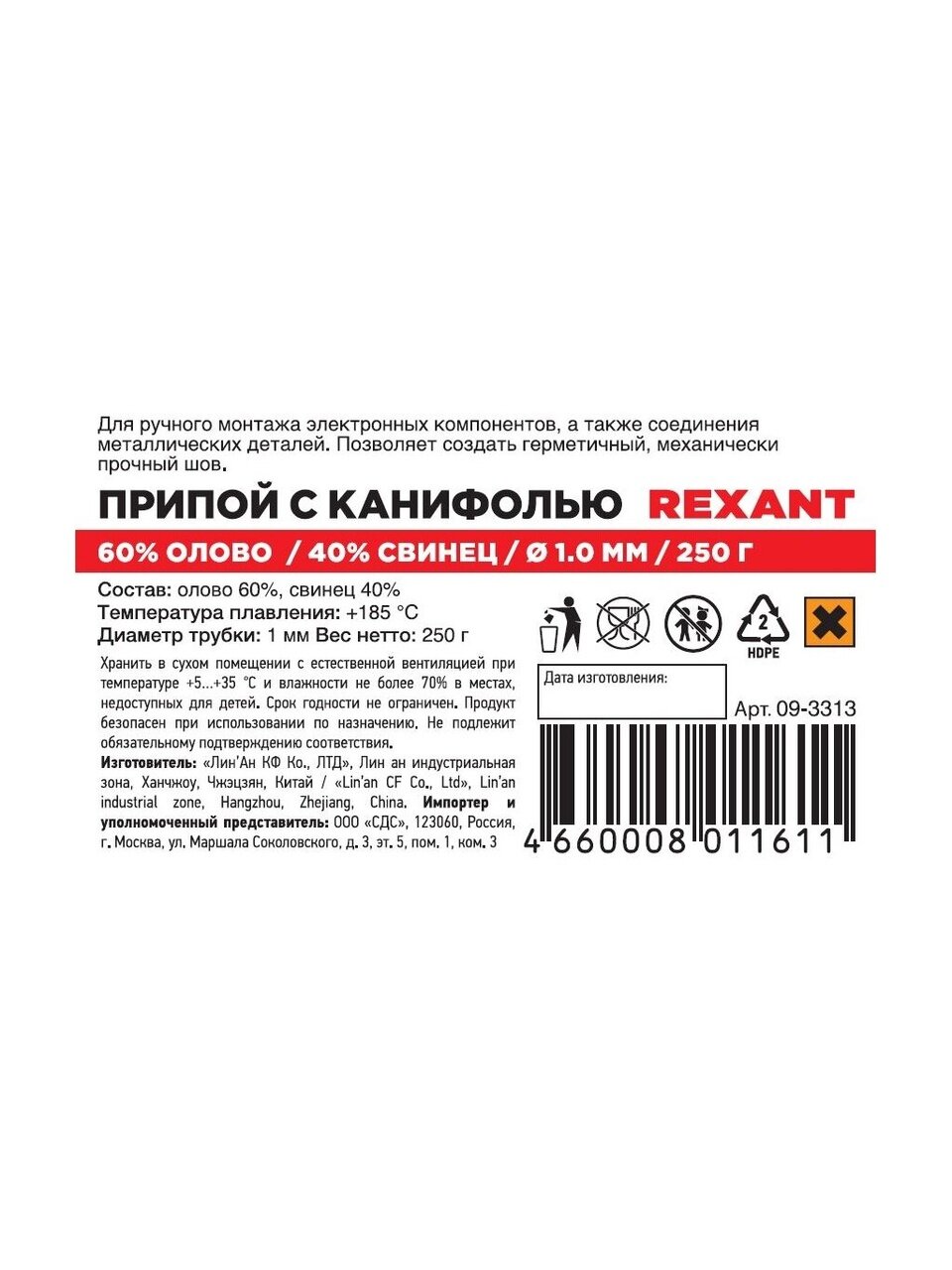 Покупка припоя с канифолью Sn60% Pb40% Flux 2.2% Rexant позволит выполнять пайку быстро, качественно и без лишних затрат. Благодаря сбалансированному составу и удобной упаковке, достигается профессиональный результат даже в домашних условиях. Припой идеально подходит для дачи, дома, мастерской или гаража. Использование этого продукта – залог долговечных и прочных соединений, что особенно важно для безопасной эксплуатации бытовых приборов и электроники. Такой выбор экономит время, снижает расходы на обслуживание и обеспечивает уверенность в результате каждого ремонта.