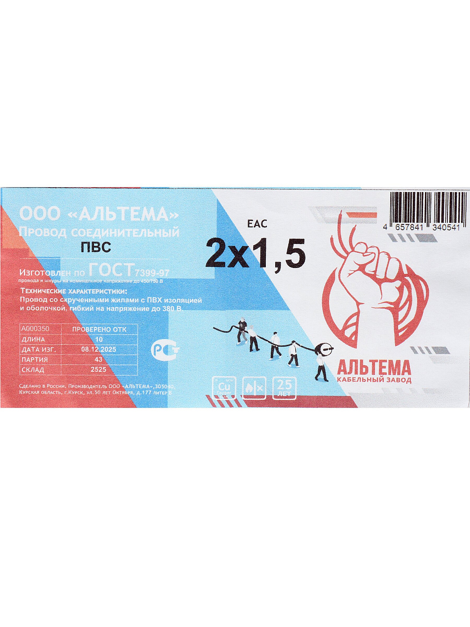 Две медные жилы по 1.5 мм², длина 10 м, гибкость, белая изоляция, стандарт ГОСТ, страна продавца — Россия.