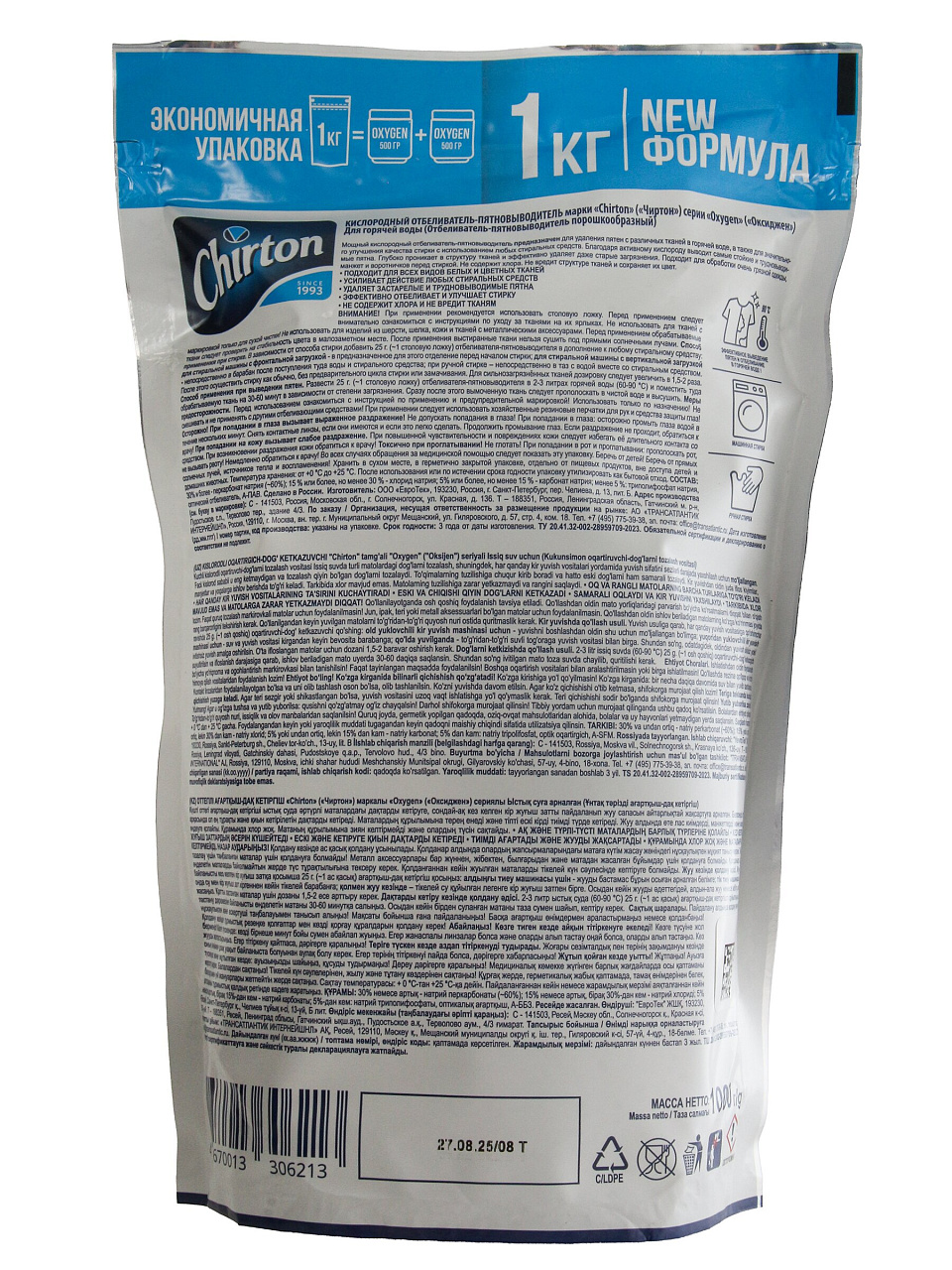 Отбеливатель Chirton Oxygen 1 кг — быстрое удаление сложных пятен без хлора, безопасно для тканей и горячей воды. Решение для чистоты и свежести!