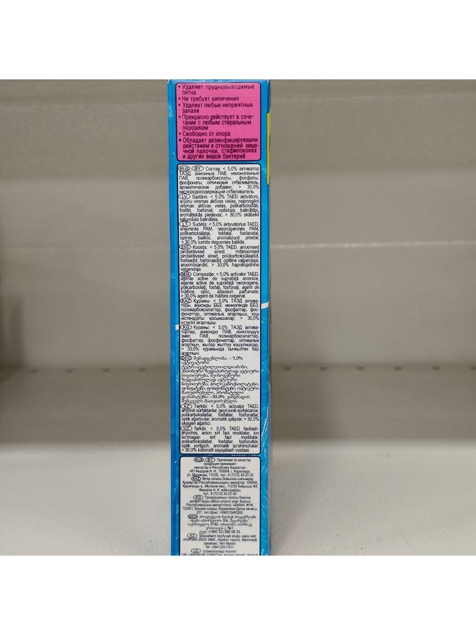 Мягко воздействует на волокна, ткань не теряет прочность, не деформируется и не желтеет. Является активатором стирки, идеально подходит для цветного белья, совместим с любыми моющими средствами. Удаляет трудновыводимые пятна. Дезинфицирует бельё и различные поверхности.