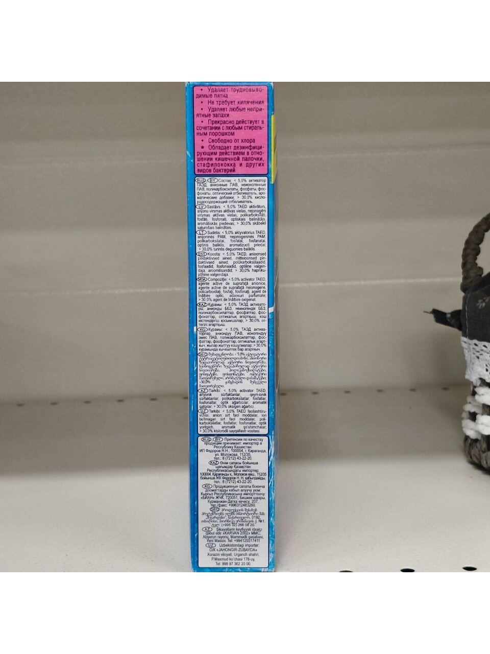 - Состав: < 5% активатор ТАЭД, анионные ПАВ, неионогенные ПАВ, поликарбоксилаты, фосфаты, фосфонаты, >30% кислородосодержащий отбеливатель, оптический отбеливатель, ароматические добавки;