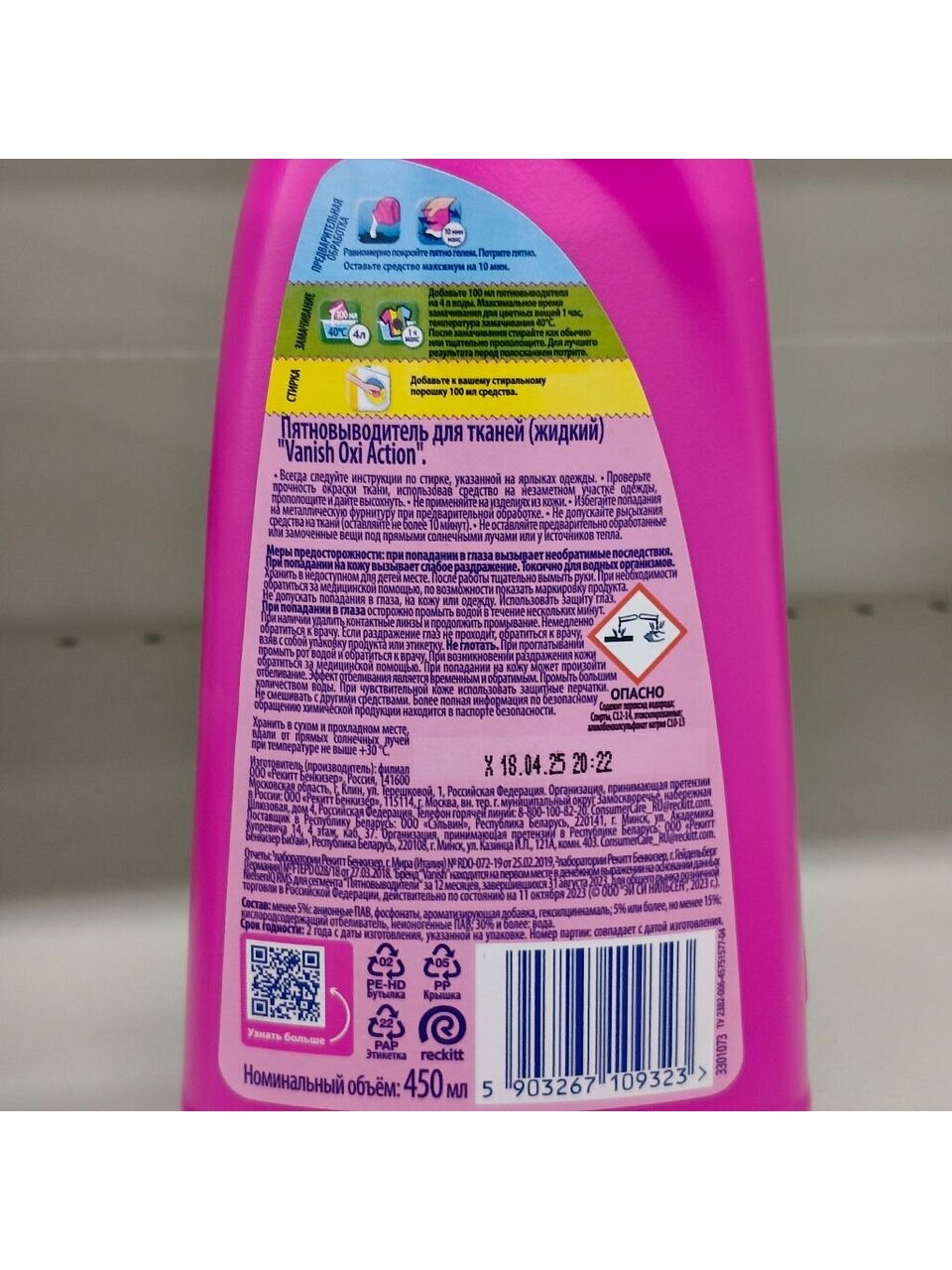 Жидкий пятновыводитель Vanish Oxi Action содержит активный кислород, который удаляет пятна и сохраняет цвет ваших вещей. Подходит для повседневных тканей, таких как хлопок, полиэстер. А также для белых и цветных вещей.