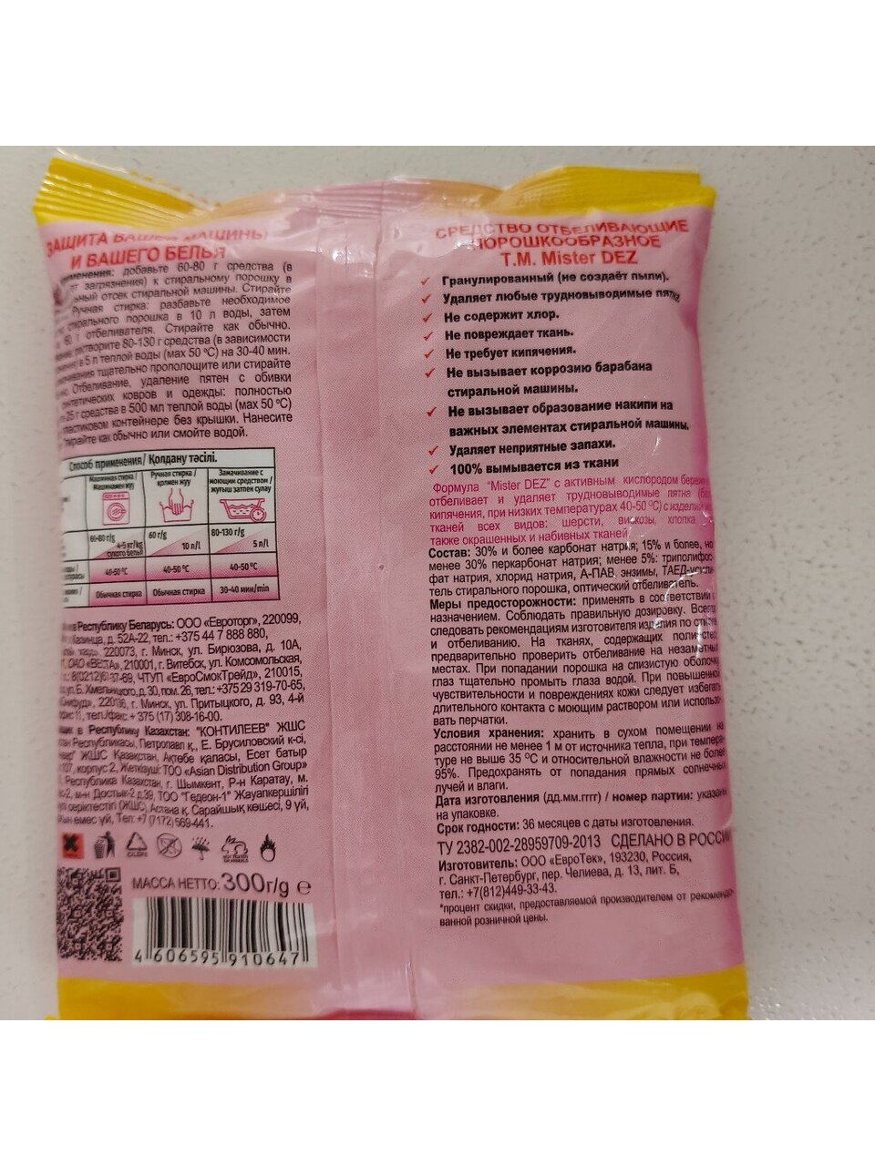 Вы можете приобрести «Пятновыводитель-отбеливатель Mister Dez, Eco-Cleaning, 300 г, порошок, для белья, кислородный» и другие товары в нашем интернет-магазине в Серпухове по низким ценам и с бесплатным самовывозом.