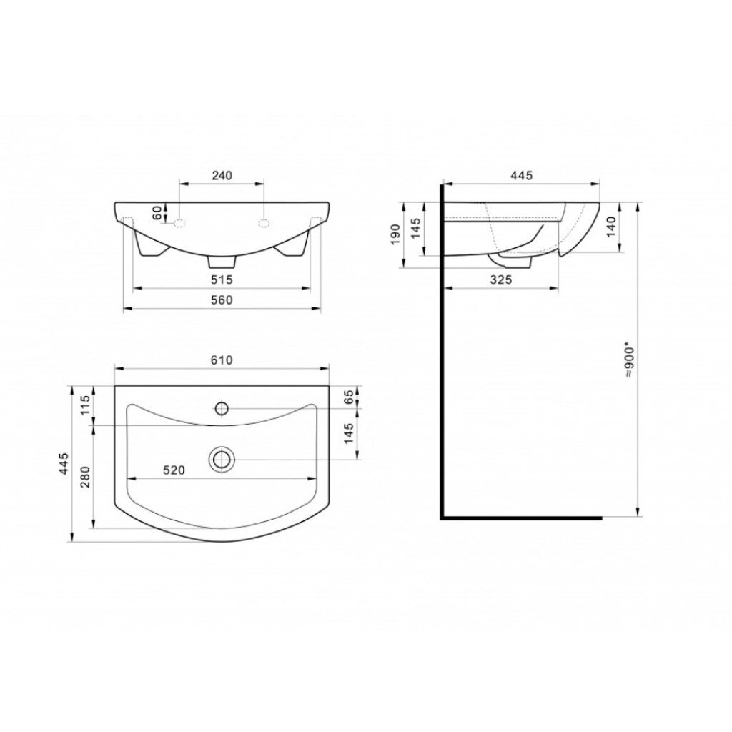 Умывальник встраивается сверху в мебельную тумбу, что обеспечивает надёжную фиксацию и экономит место. Размер чаши — 60 см, стандартное отверстие под смеситель — 1 шт.