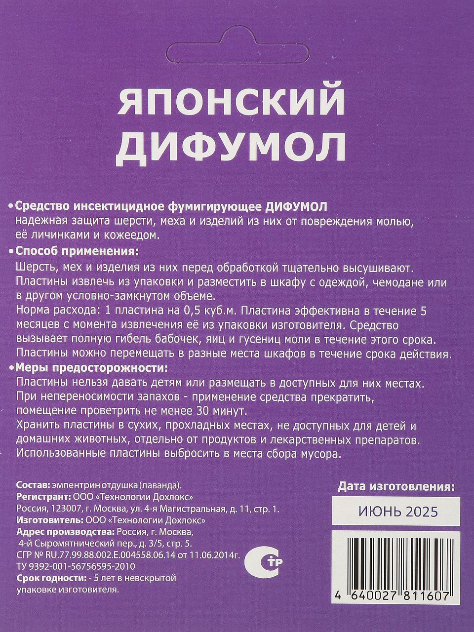 Пластины «Сгинь! Японский дифумол» от моли — быстрое решение для защиты вещей: действует 24/7, хватает на 10 шкафов, безопасно для взрослых.