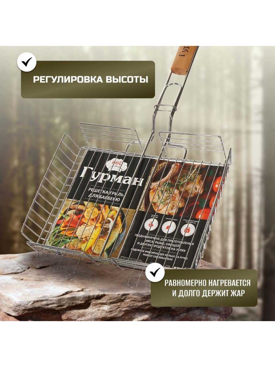 Решетки барбекю применяются для приготовления мяса, рыбы, окорочков, сосисок, сарделек, колбасок, бифштексов, овощей и многого другого на мангале, костре, в камине. Решётка для барбекю порадует всех любителей пикников, загородных поездок и дачных посиделок. Надёжная деревянная ручка обеспечит комфортное использование, позволяет уменьшить вероятность получения ожога во время готовки, а размер решётки позволит разместить на ней достаточное количество мяса. В отличие от шампуров решетка универсальна. Она проста в эксплуатации и не вызывает сложностей в уходе.