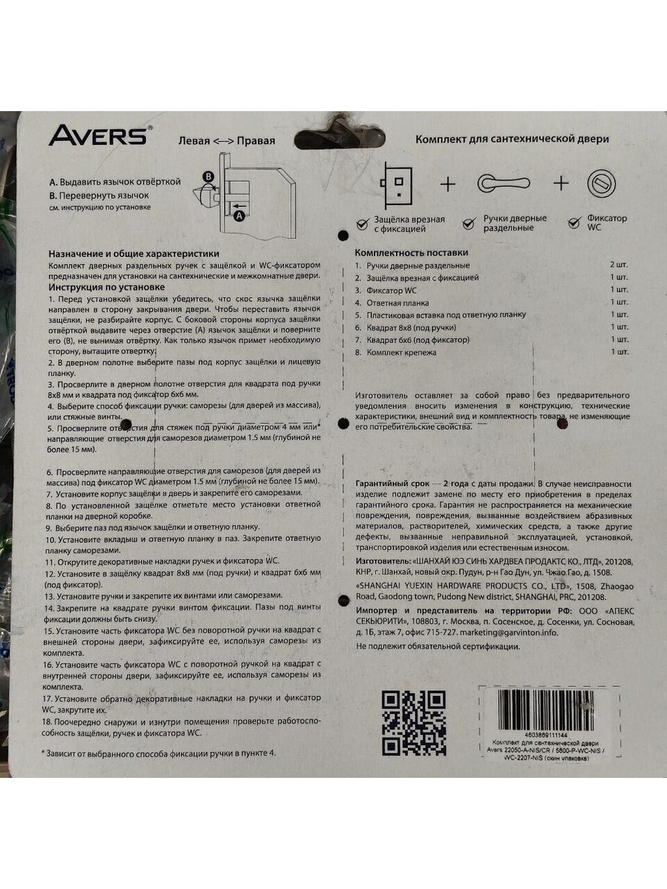 Вы можете приобрести «Комплект для сантехнической двери Avers, 22050-A-NIS/CR/5600-P-WC-NIS/WC-2207-NIS, 31060, скин упаковка, матовый никель» и другие товары в нашем интернет-магазине в Шахтах по низким ценам и с бесплатным самовывозом.