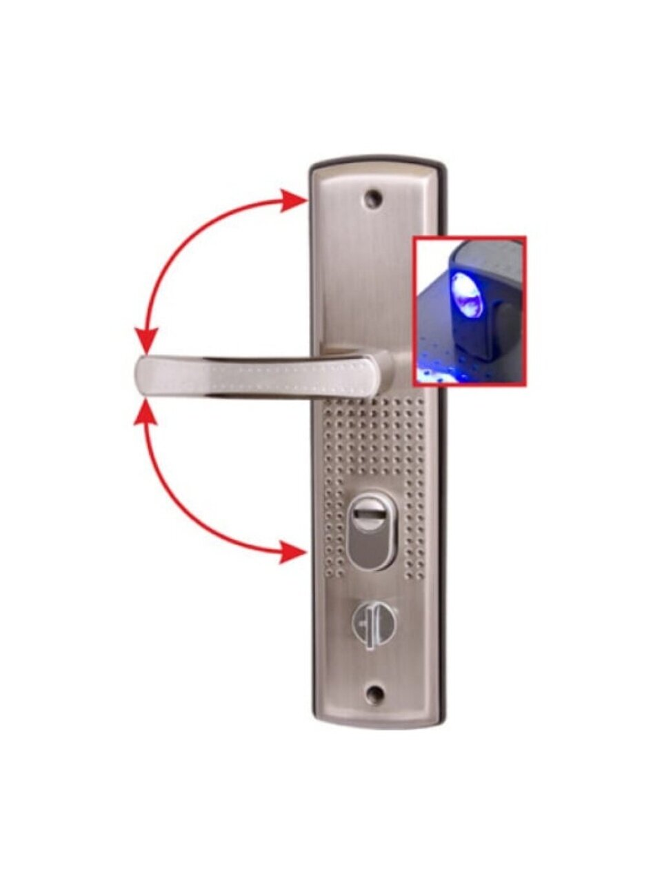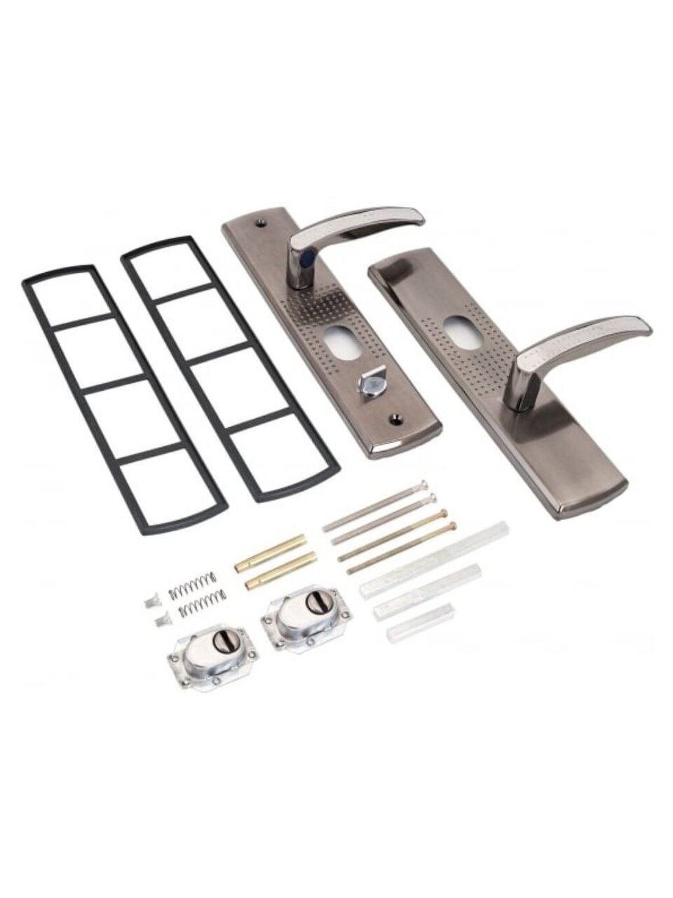 В комплект входят две ручки, винтовые стяжки, пластиковые прокладки и квадратный штырь (8х8 мм) 110 мм, комплекты стержней для автоматических и не автоматических замков. На наружней ручке имеется подсветка замочной скважины.