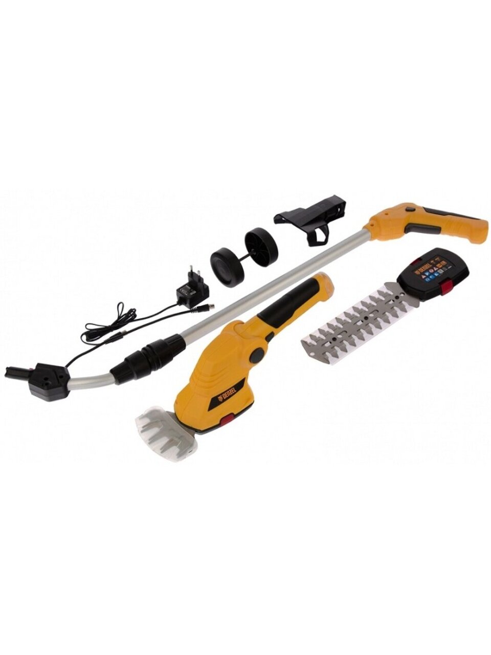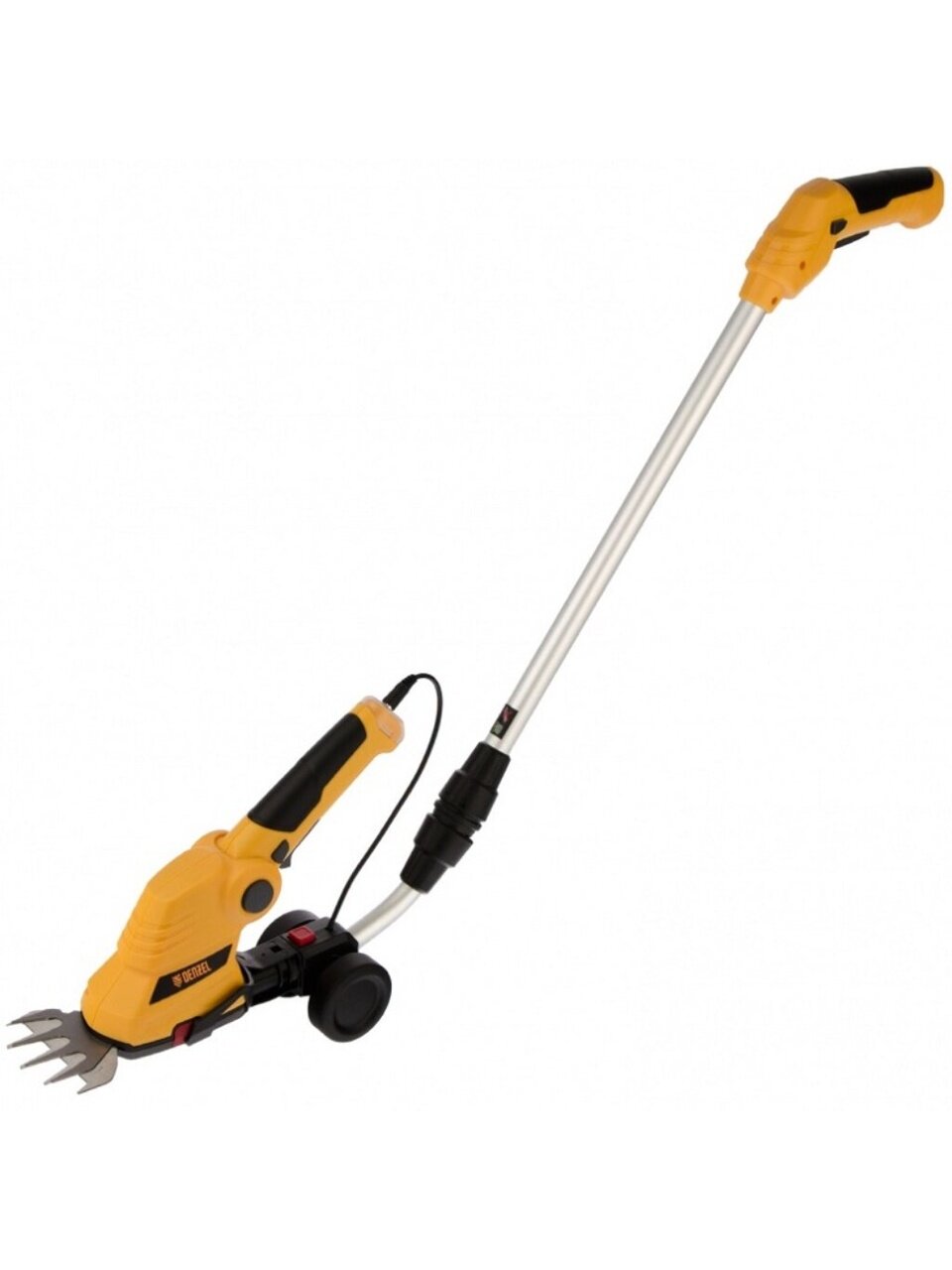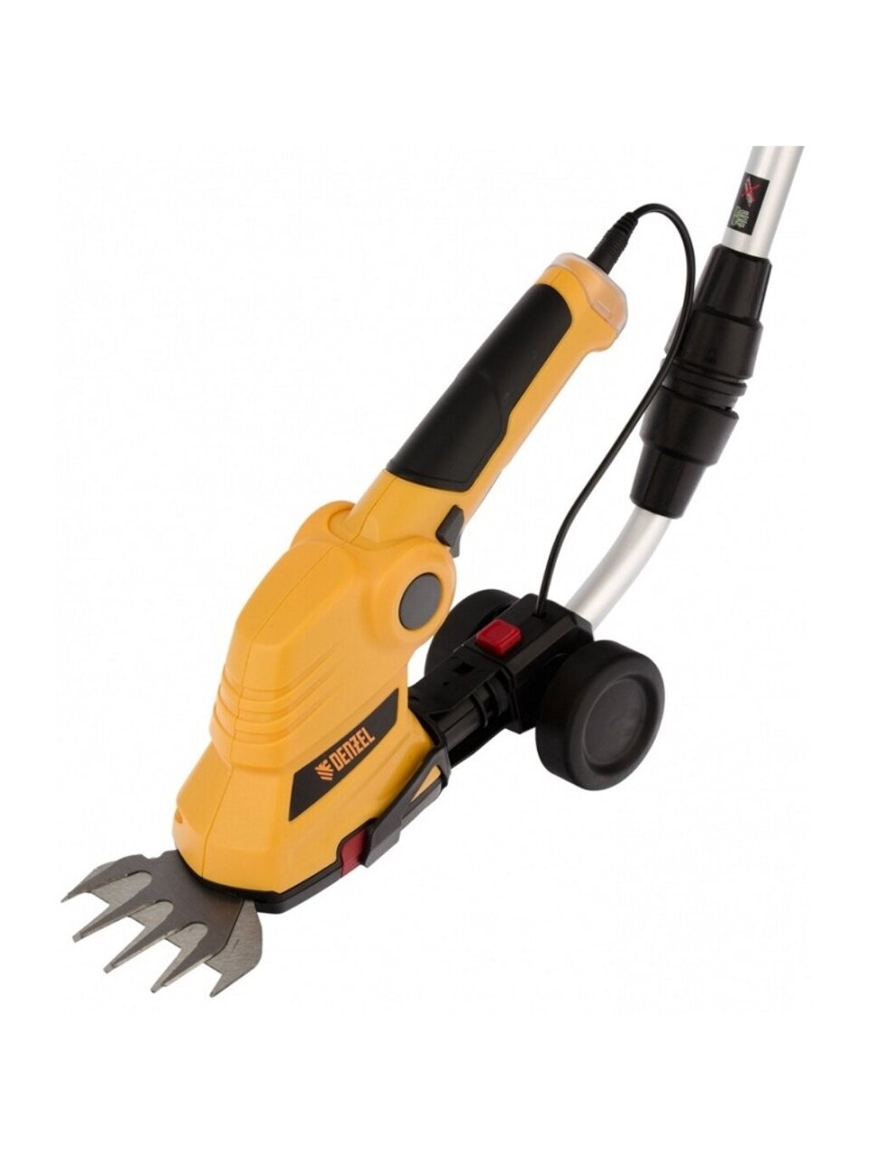 Аккумуляторные ножницы-кусторез Denzel G801E 968157 с телескопической штангой, с Li-Ion батареей емкостью 1,5 Ач и напряжением 7,2 В, используются для ухода за садовым участком. Поставляются с двумя насадками: для подрезания газонной травы и для обрезки кустов и тонких веток деревьев. Небольшой вес и съемная штанга с колесным блоком обеспечивают комфортное использование ножниц-кустореза.